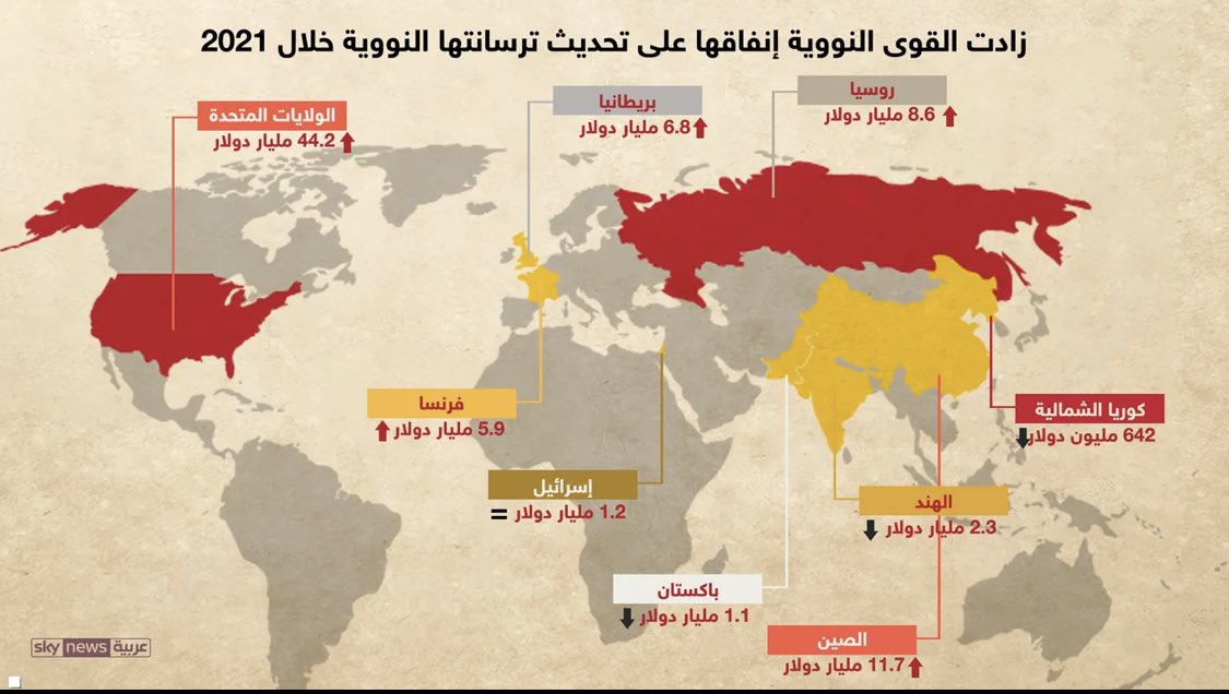 نشرت منظمة آيكان إحصائيات خطيرة تشير لقرب النزاع في الأسلحة النووية حيث أن دول النووية زادت بنمو غريب برنامجها النووي لأول مرة منذ الحرب الباردة العام الماضي أبرزها: