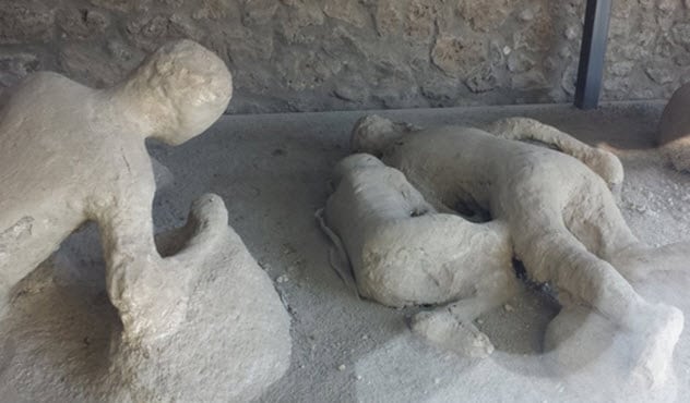 خلال مرحلة حفر قناة بالمنطقة لتظهر جثثهم على شكل تماثيل إسمنتية على نفس هيئاتهم وأشكالهم التي كانوا عليها وهم يقومون بمعصية الخالق وقد دفن إلى جانبها مدينة هيركولانيوم والعديد من الفيلات في المنطقة المحيطة