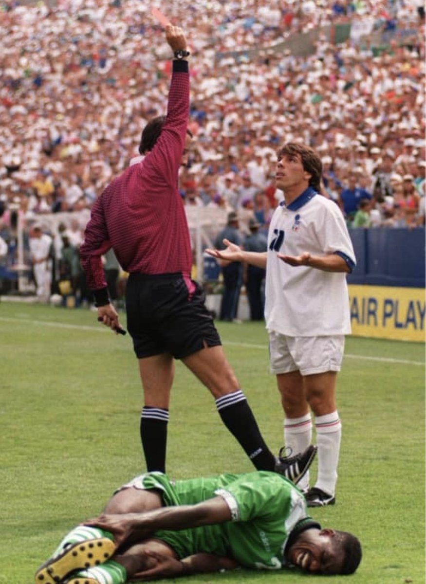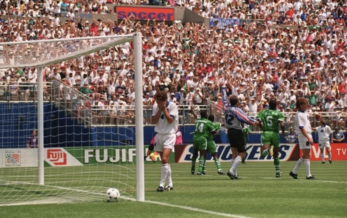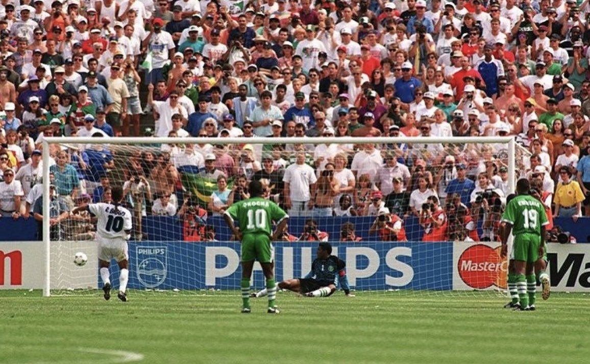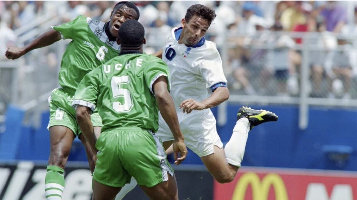 1️⃣2️⃣ الفريق النيجيري ويمرر الكرة لروبرتو #باجيو الذي سددها بكل دقة في الزاوية اليمنى للحارس النيجيري بيتر روفاي كهدف تعادل قاتل.