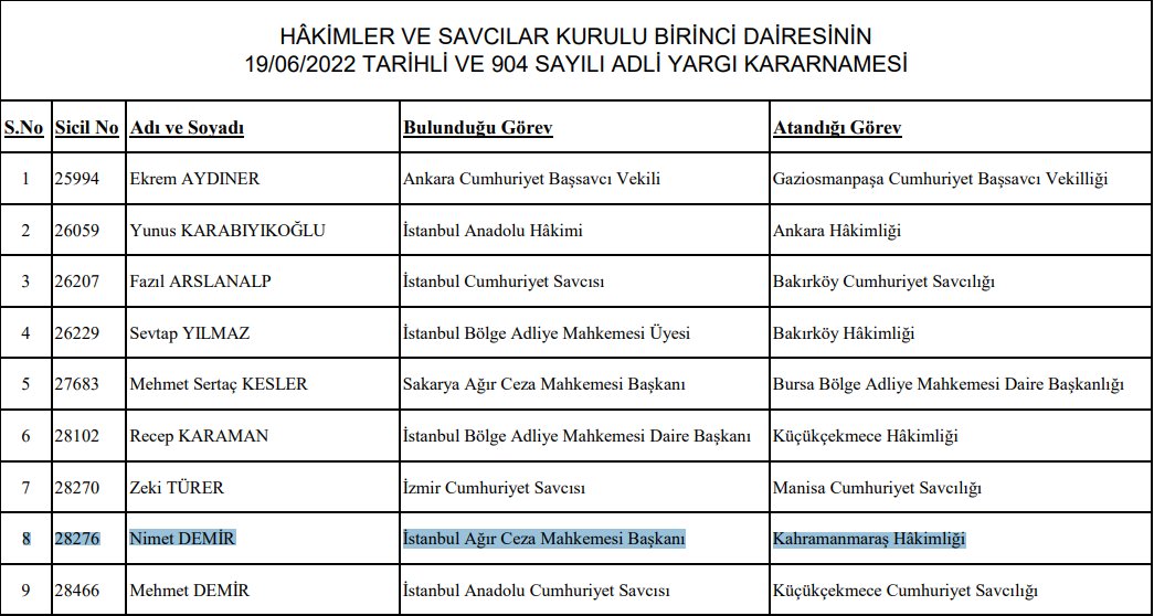 يوم امس اعلن مجلس القضاء والمدعين في تركيا عن تغيير اماكن عمل 5426 قاض ومدعي كان من بينهم رئيس محكمة اسطنبول نعمت ديمير