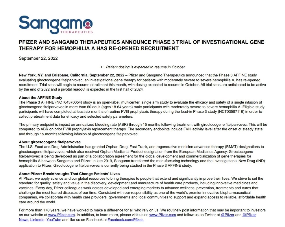 فايزر @pfizer وسانجامو @SangamoTx تعلنان عودة التجارب الإكلينيكية المرحلة3️⃣للعلاج الجيني التجريبي