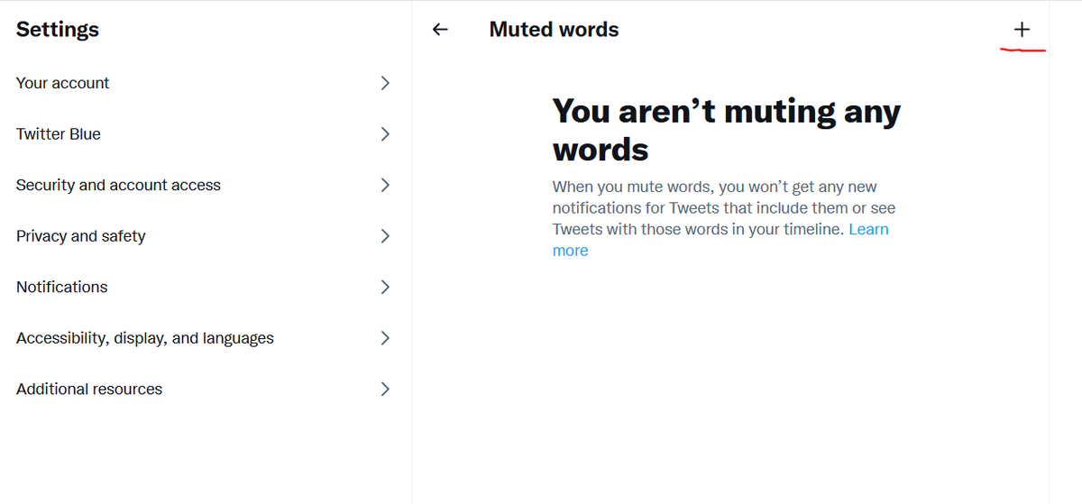 - انتقل الى Setting ثم Privacy and Safty ثم Mute and block ثم Muted Words