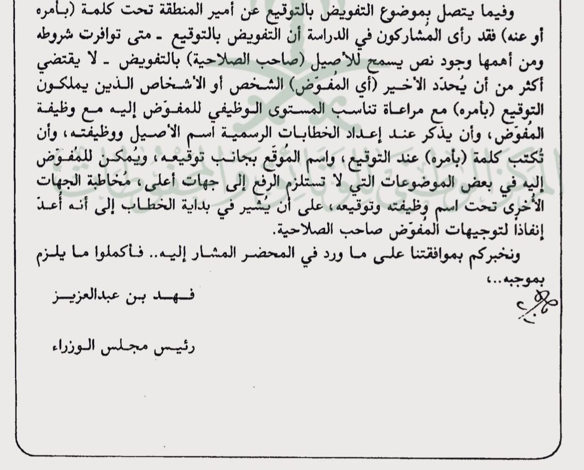 1/ يفرّق القانون الإداري بين تفويض الاختصاص وتفويض التوقيع. فتفويض الاختصاص معناه: "أن يعهد الرئيس بنقل بعضاً من اختصاصاته التي يستمدها من النصوص القانونية لأحد مرؤوسيه، وهو ما يترتب عليه ممارسة المفوض إليه تلك الاختصاصات دون الرجوع إلى الرئيس المفوض"، ويسميه البعض "تفويض السلطة"