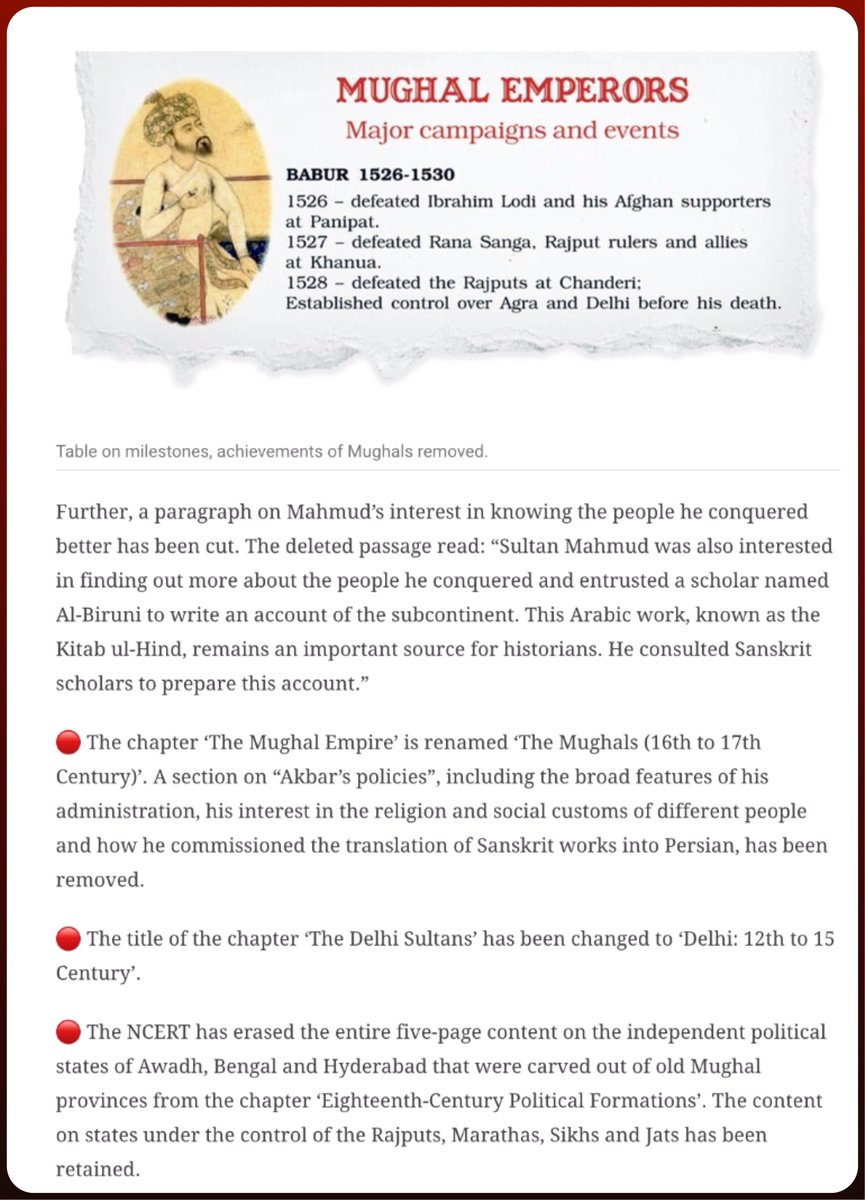 8. وتجلت أوضح التغييرات بحذف عدة صفحات عن سلطنة دلهي من أحد كتب الصف السابع، وهذه السلطنة حكمت البلاد بين عامي 1206 و 1526 كما جرى حذف الفصل المرتبط بالسلاطين المغول المسلمين وأهم الأحداث والإنجازات التي حققها أباطرةٌ مثل بابر، وهمايون، وأكبر، وجهانكير، وشاه جهان، و #أورانك_زيب.