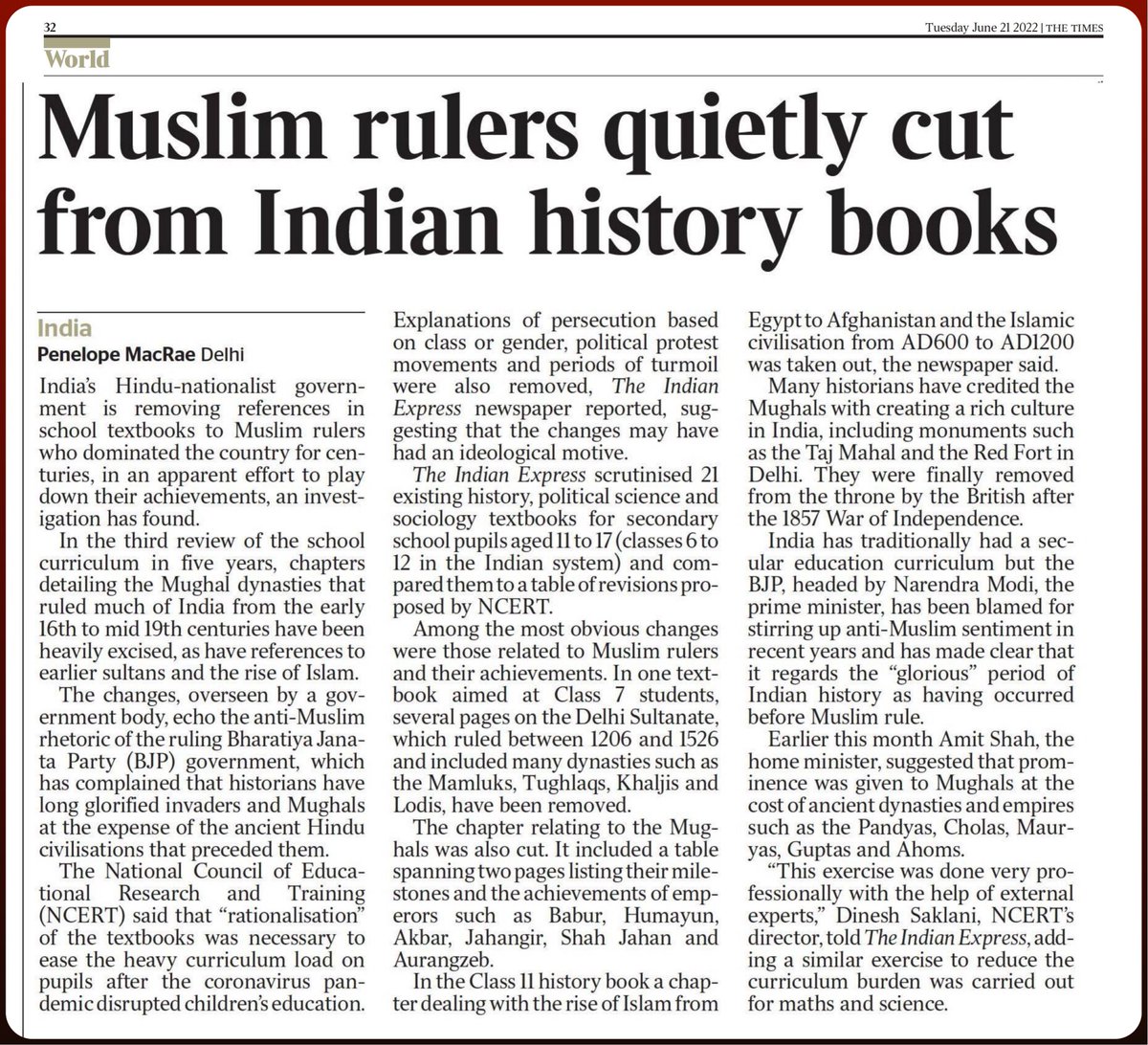 كانت #الهند تُعرف تاريخيا بمناهج تعليمية علمانية، لكن حزب #بهاراتيا_جاناتا الحاكم بقيادة رئيس الوزراء ناريندرا #مودي، الذي يعمل منذ سنوات على مناهضة الوجود الإسلامي في الهند ، قد أعرب بوضوح عن رؤيته بأن التاريخ الهندي شهد عصر "مجده" قبل الحكم الإسلامي. !!
