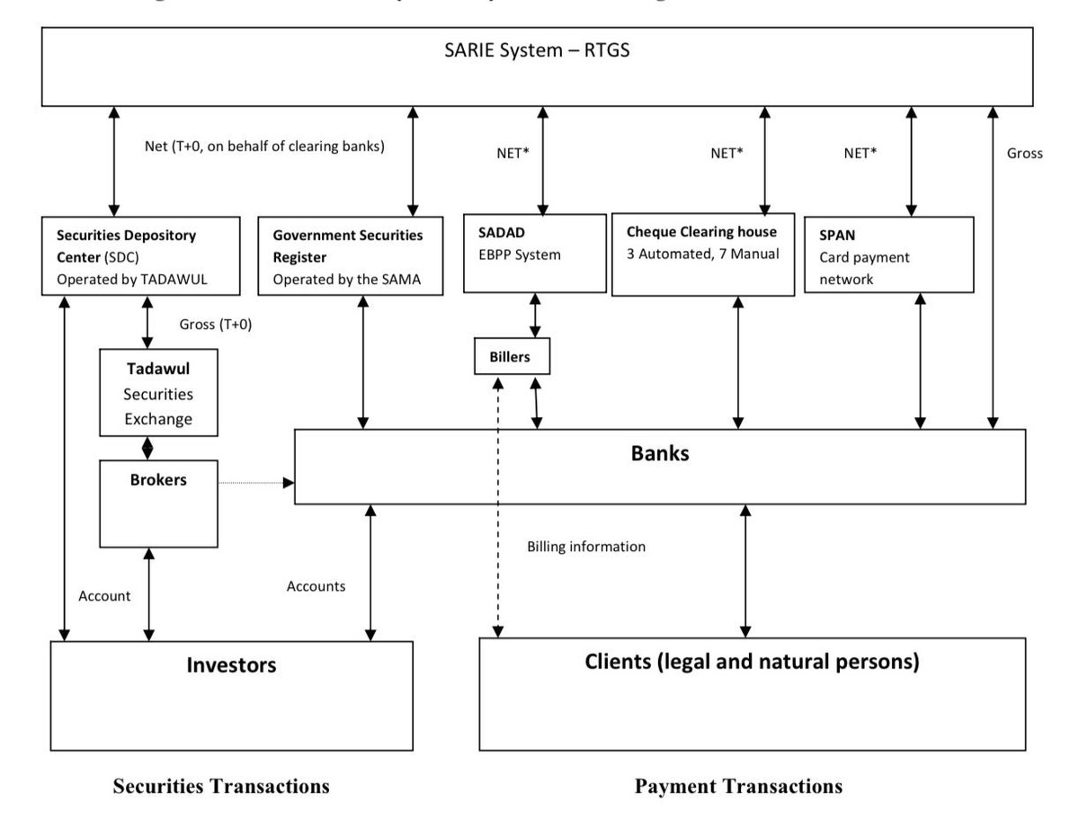 ونظام مقاصة الشيكات "Cheque Clearing house" وهي عملية نقل النقود من البنك الذي يتم فيه سحب الشيك إلى البنك الذي تم إيداعه فيه ونظام السندات الحكومي (government securities) الذي يدار من قبل البنك المركزي "ساما"، واخيراً ايداع الاوراق المالية ويتم عن طريق تداول.