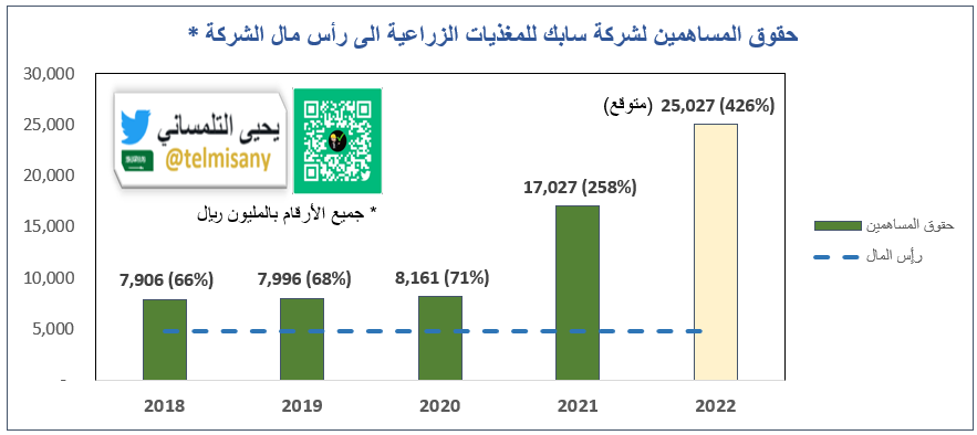 اذا استمرت الشركة بتحقيق الأرباح بنفس وتيرة 2021 فمتوقع لها ان تحقق 8 مليار ريال صافي ارباح بنهاية 2022 مما يجعل حقوق المساهمين المتوقعه تصل الى 25 مليار بنهاية 2022 اي بنسبة ارتفاع 426% عن رأس مال الشركة ان شاء الله