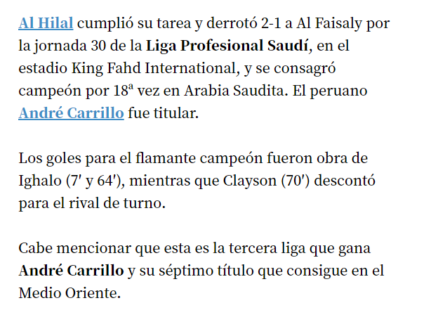 💥💥 صحيفة "elcomercio" البيروفية: "#الهلال يفوز على الفيصلي ويحقق لقب الدوري السعودي للمرة الـ18 في تاريخه.. أندريه كاريلو يحقق مع فريقه للمرة الثالثة على التوالي لقب الدوري السعودي.. هذا هو اللقب السابع للدولي البيروفي في مسيرته".