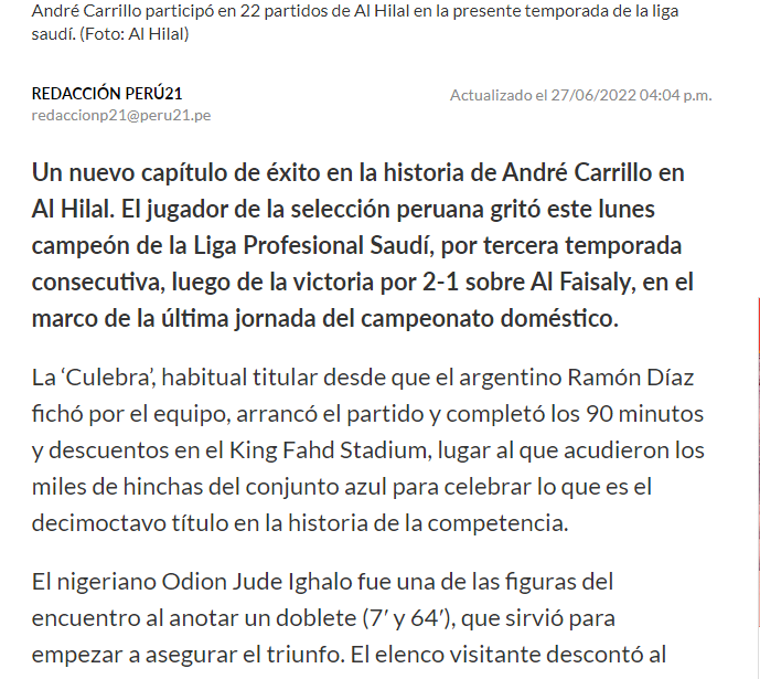 💥💥 صحيفة "peru21" البيروفية: "بالنسبة لكاريلو، هذا هو النجاح الثالث على التوالي في الدوري السعودي والثامن منذ انضمامه إلى #الهلال في يوليو 2018، حيث حقق اللاعب كأس السوبر السعودي (2019 و 2022) وكأس الملك للأبطال (2020) ودوري أبطال آسيا (2019 و 2021)".