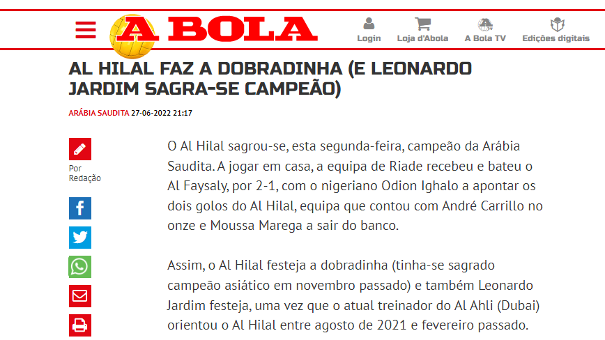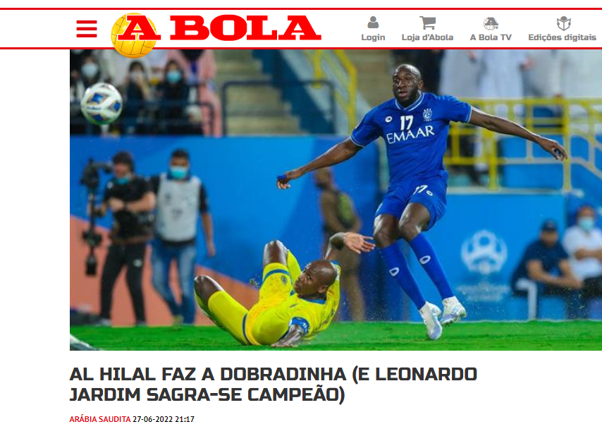 💥💥 صحيفة "آبولا" البرتغالية: "توج #الهلال بطلاً للسعودية يوم الاثنين بعد الفوز على الفيصلي بنتيجة 2-1، وسجل النيجيري أوديون إيغالو هدفي الهلال.. الفريق الذي قاده في بداية الموسم البرتغالي ليوناردو جارديم حقق اللقب للعام الثالث على التوالي".