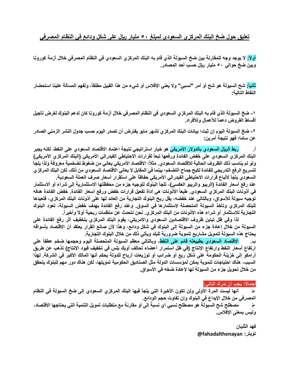 1- ضخ السيولة الذي قام به البنك المركزي السعودي في النظام المصرفي خلال أزمة كورونا كان لدعم البنوك لغرض تأجيل أقساط القروض دعماً للأعمال وللأفراد.
