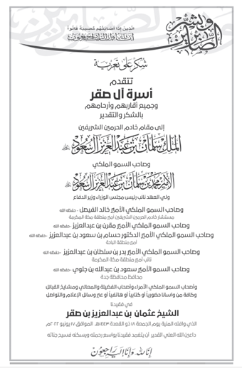 @Stateman_KSA كان لبرقية التعزية من مولاي خادم الحرمين الشريفين وسمو ولي العهد الأمين- حفظهم الله–عظيم الأثر في نفوس أسرته ومواساتهم.