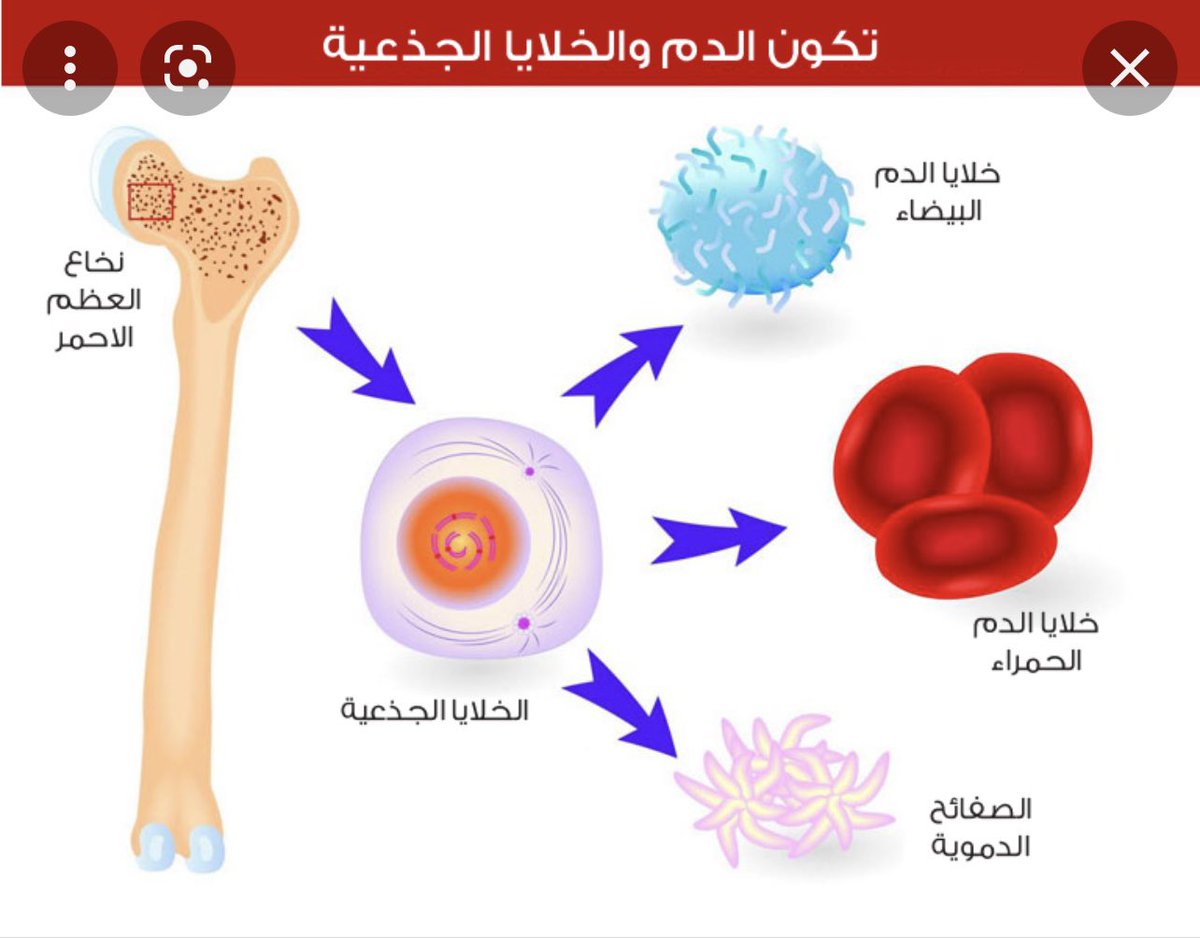 تحوي ولها علاقة:بخلايا كريات الدم الحمراء،وخلايا الدم البيضاء،وصفائح الدموية