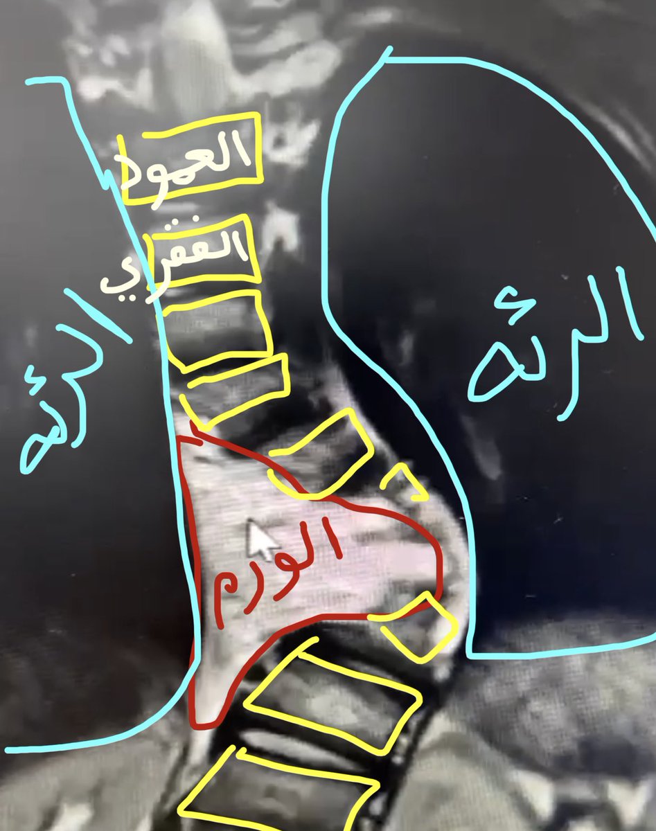 كان ورما يخرج من اعصاب العمود الفقري ويدخل في الصدر و يضغط على الرئة و ملتصق بشرايين و اوردة اساسية من والى القلب وتسبب في جنف شديد في العمود الفقري!