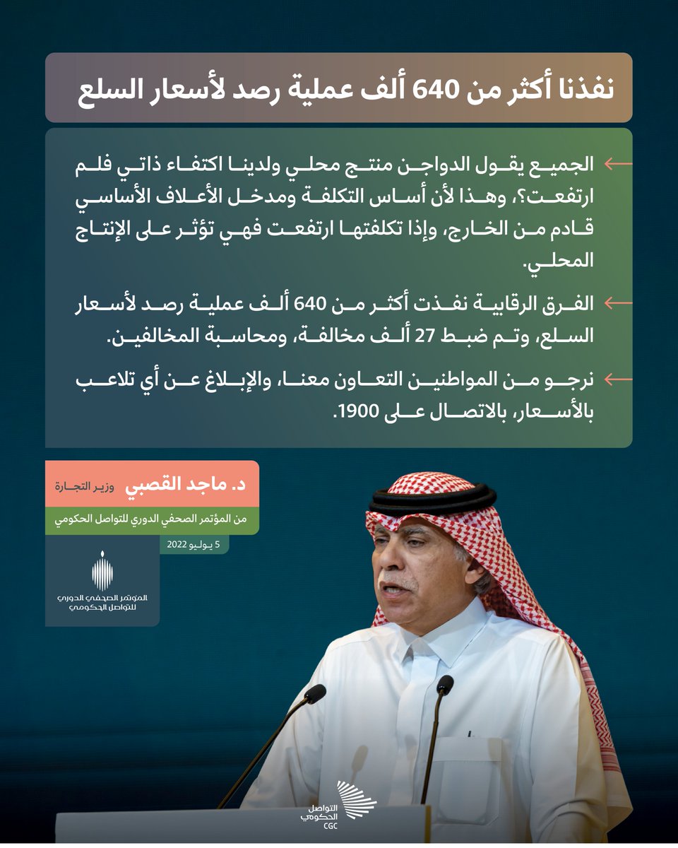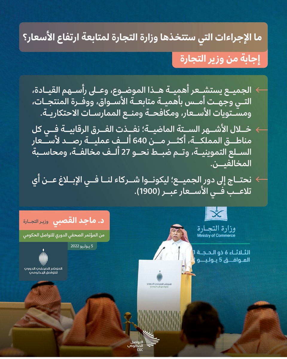 "الفرق الرقابية نفذت أكثر من 640 ألف عملية رصد لأسعار السلع، وتم ضبط 27 ألف مخالفة، ومحاسبة المخالفين"؛ وزير التجارة خلال #مؤتمر_التواصل_الحكومي.