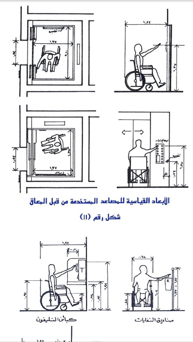 - في حال وجود مصعد وهو الأفضل يُراعى تصميمه وفق الأبعاد المناسبة(كما في الصورة)