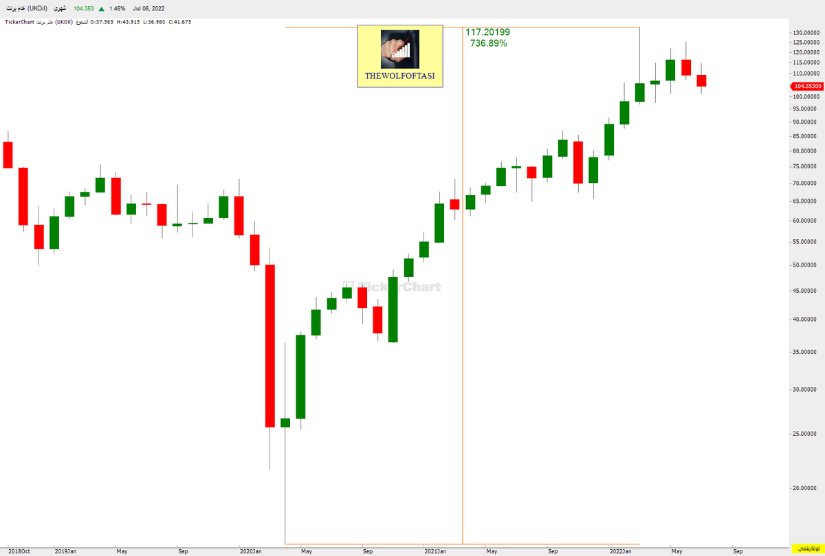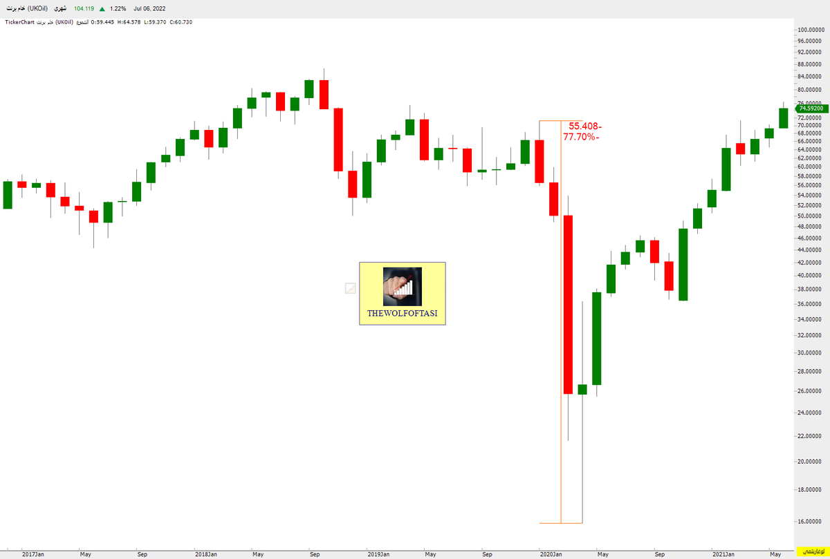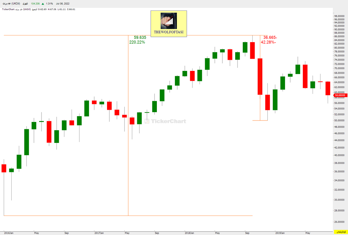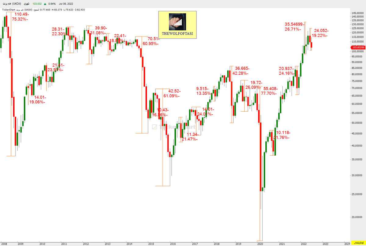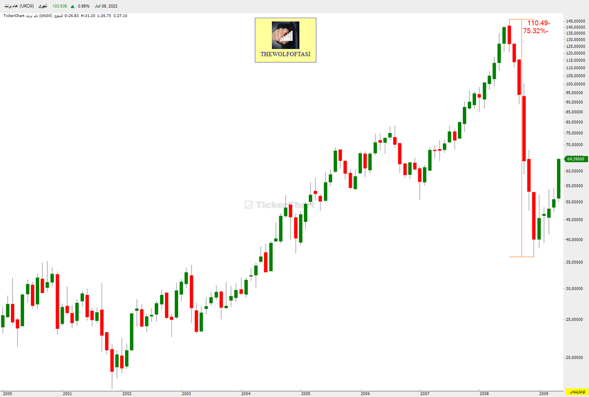 حيث هبط خام #برنت بنسبة 75% من مستويات الـ 146 دولار إلى 36 دولار خاسراً (110 دولار) ..