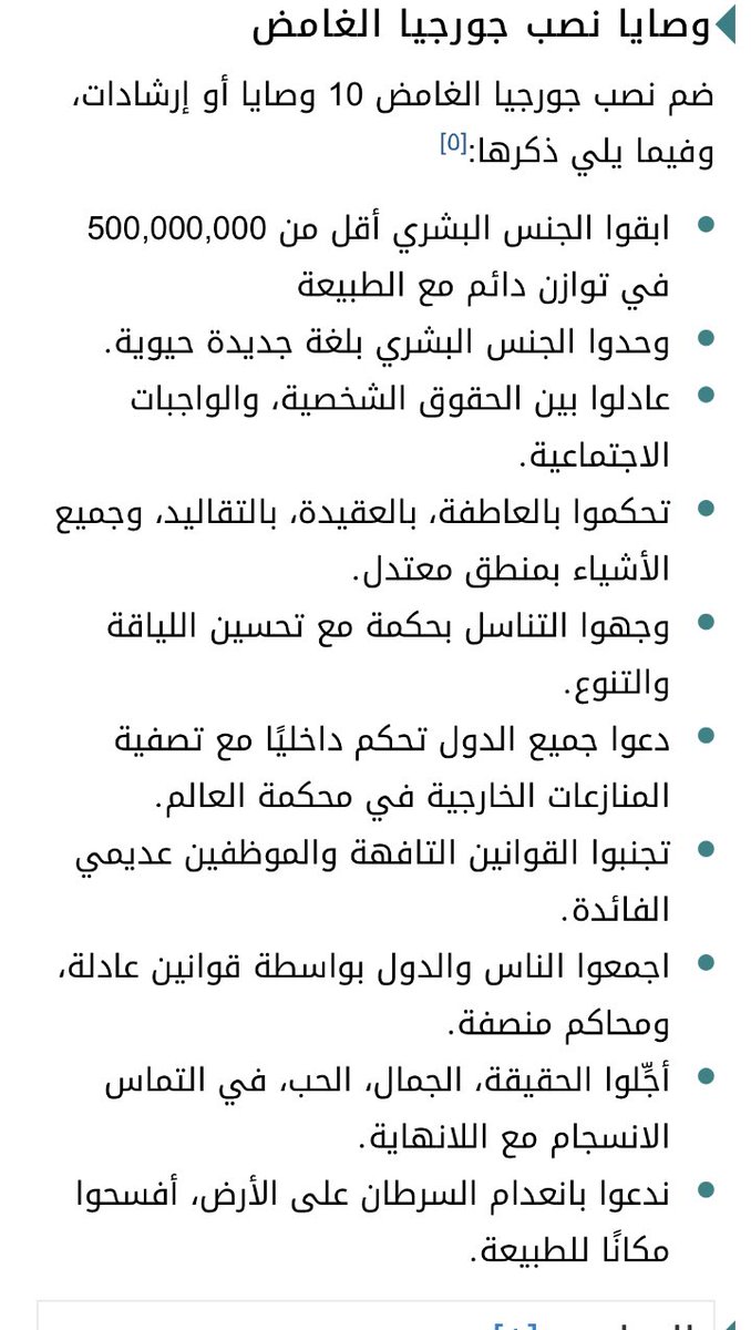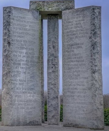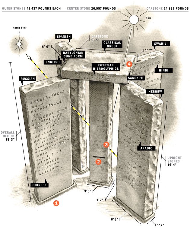 هذا النصب تحيط به دوامة النظريات بسبب الكلام المنقوش عليه من 8 لغات ومنها العربية ومكتوب فيه 10 وصايا ومنها وصية تقليل عدد سكان العالم أقل من 500 عام، يتألف هذا النصب من 4 ألواح ضخمة من الجرانيت، ويزن كل لوح قرابة 20 طناً ويعمل النصب كساعة شمسية، وبوصلة وتقويم.