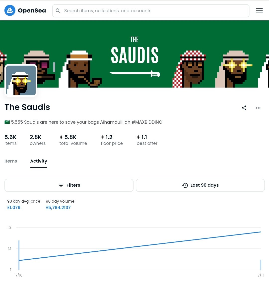 تم إطلاق سلسلة @TheSaudisNFT أمس وفي خلال ساعات قليلة قفزت لتتصدر اعلي مبيعات NFT خلال 24 ساعة الماضية بحجم تداول أكثر من 5800 $ETH أي ما يعادل 6,800,000$.