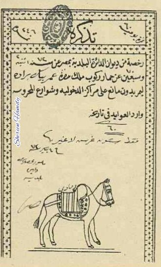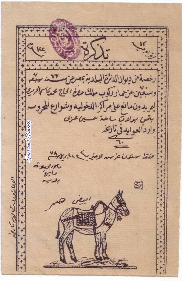 1-الحمار الرمادى المملوك لحضرة «عمر بك براده» ليمر دون مانع على محطات تحصيل الرسوم على مراكز الدخولية وشوارع المحروسة برسم عوايد ٦٠ قرش لاغير فى ٤يناير ١٨٧٢م مأمور داير محصلات ديوان الدائرة البلدية بمصر ويرسم الحمار كما لو كان بيتم تصويره فوتوغرافياً ويذكر لون الحمار فوقه👌