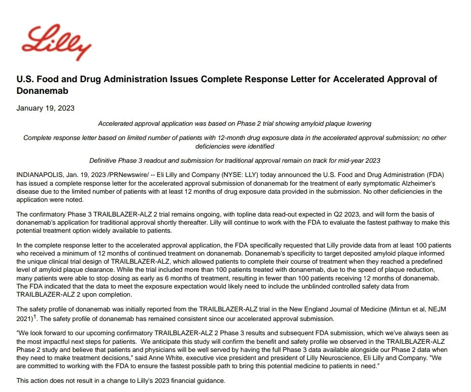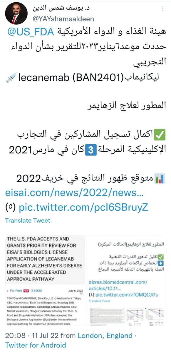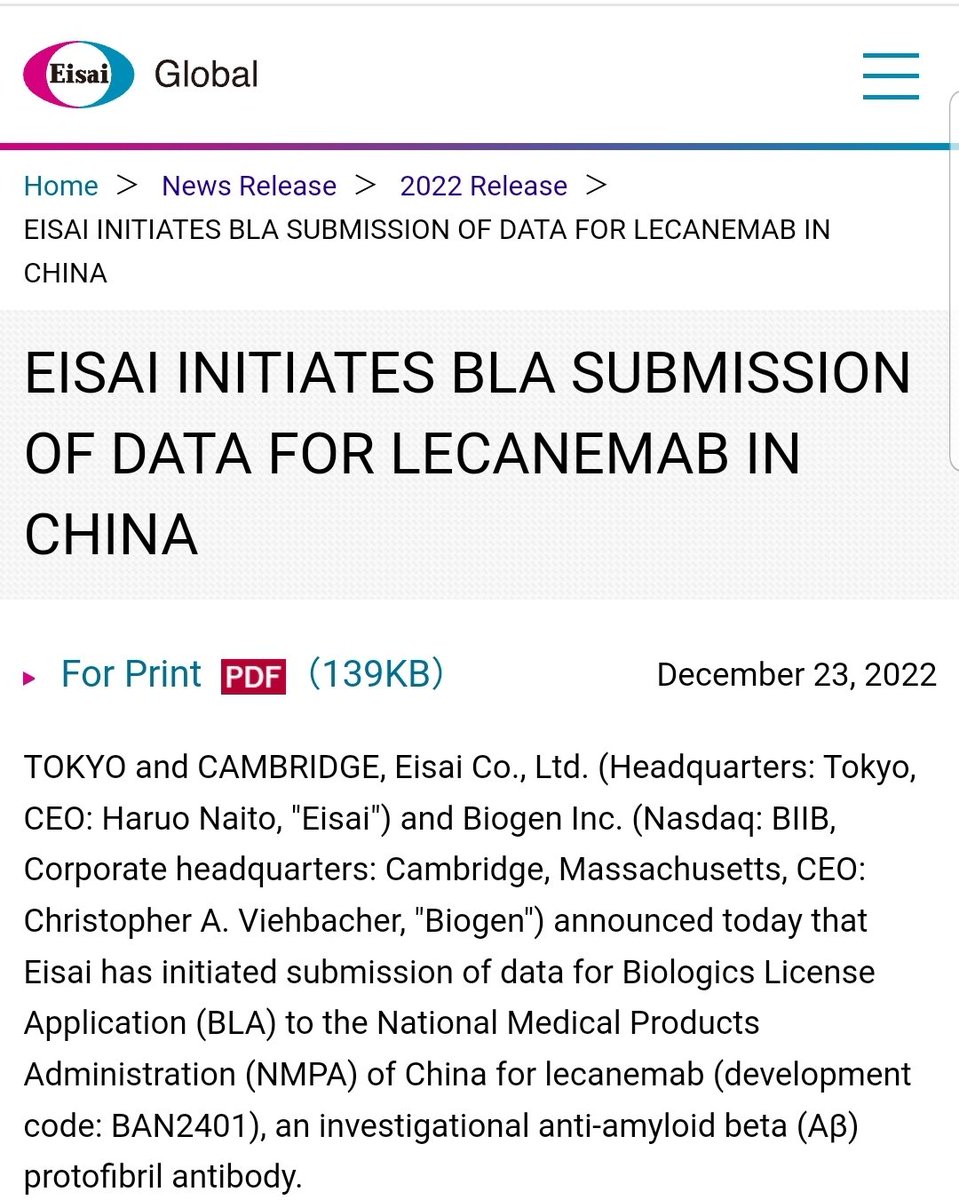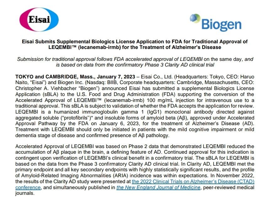 🗓٧يناير٢٠٢٣: شركة إيساي @Eisai_SDGs وبايوجين @biogen سلمت هيئة الغذاء والدواء @US_FDA طلب اعتماد كامل لدواء