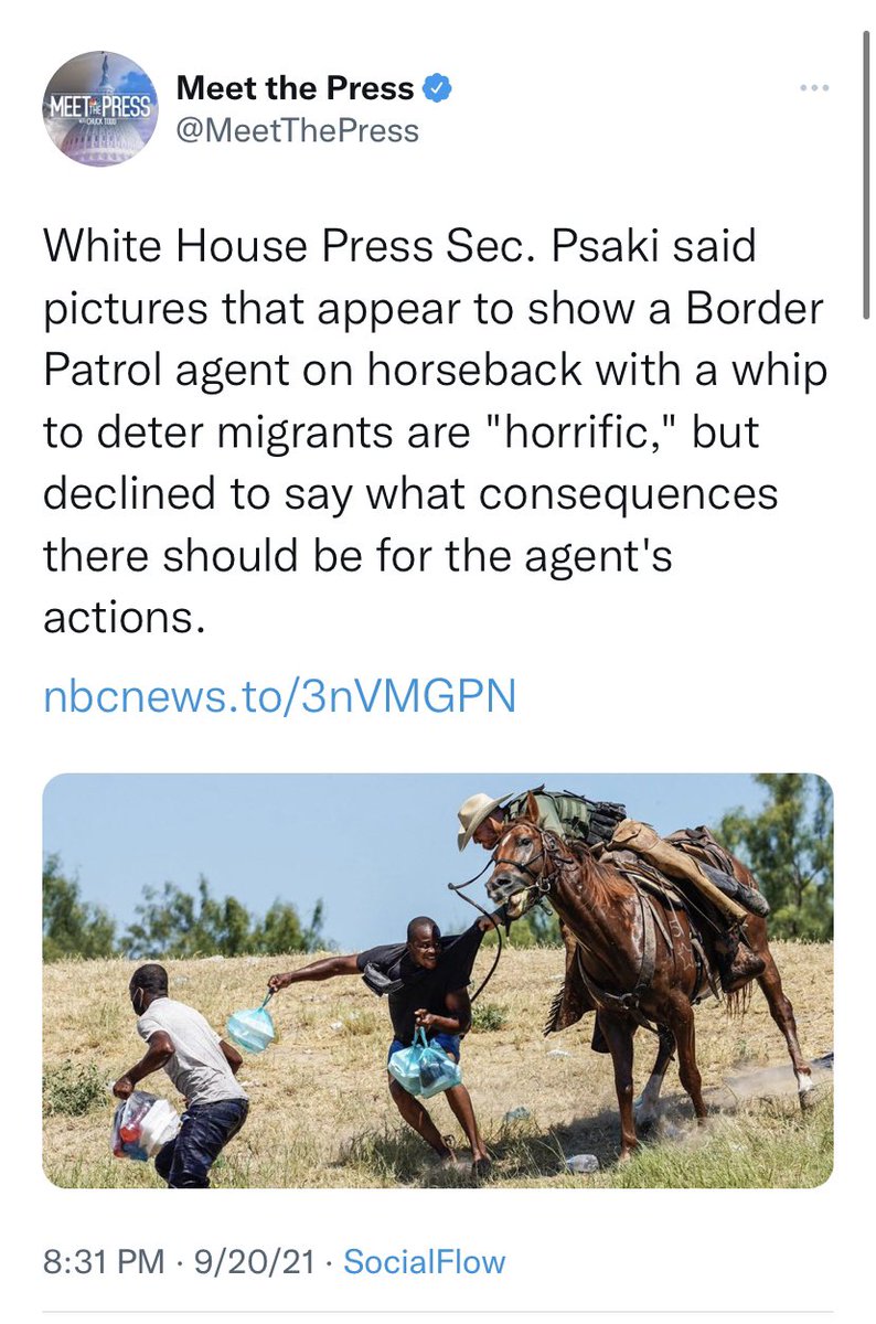 @MeetThePress seemed unsatisfied that @PressSec wouldn’t “say what consequences there should be for the agent’s actions” in response to “pictures that appear to show a Border Patrol agent on horseback with a whip” which, once again, is a lie.