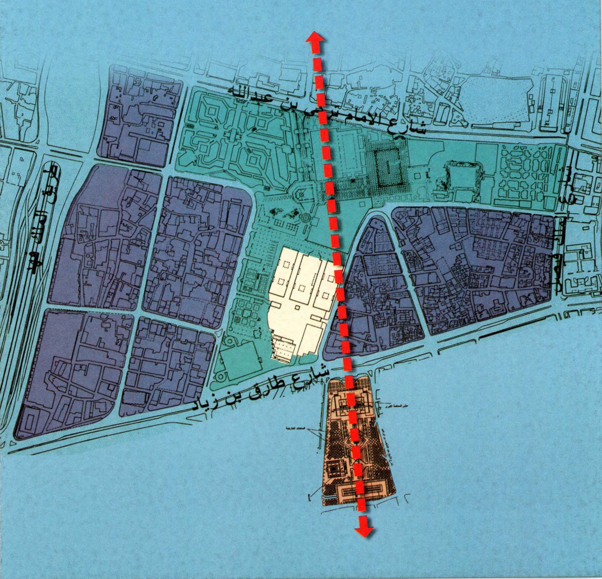 لاحظوا هنا المقترح الأولي ولاحظوا كيف تم الاستغناء عن المباني الموجودة أمام مبنى المحكمة وتم تخصيصها كفضاء عام للمنطقة الحضرية المحيطة واعتقد ان هذا الحل أسهم بشكل كبير لتحسين جودة الفراغات العامة وربطها بشبكة ممرات المشاة في المنطقة المحيطة فيما بعد.