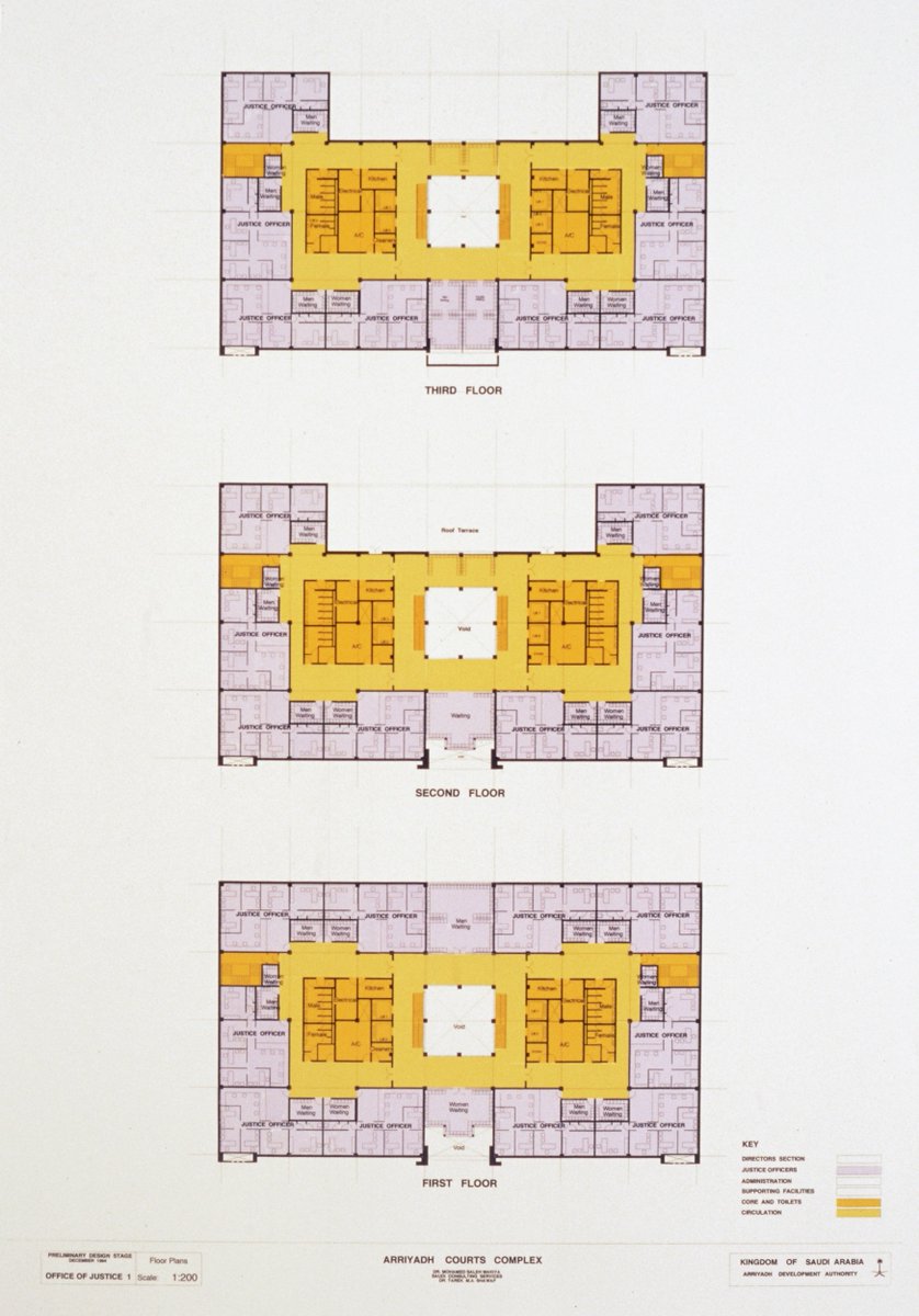 صمم المشروع المعماري العراقي محمد مكيه وتحت إشراف الهيئة العليا لتطوير مدينة الرياض آنذاك. ح الهيئة أعدت البرنامج المعماري والوظيفي ومتطلبات المشروع بالتعاون مع وزارة العدل ليقوم بعدها مكيه بتصميم مشروع يعبر عن القيمة السامية التي يقوم عليها القضاء وهي العدل