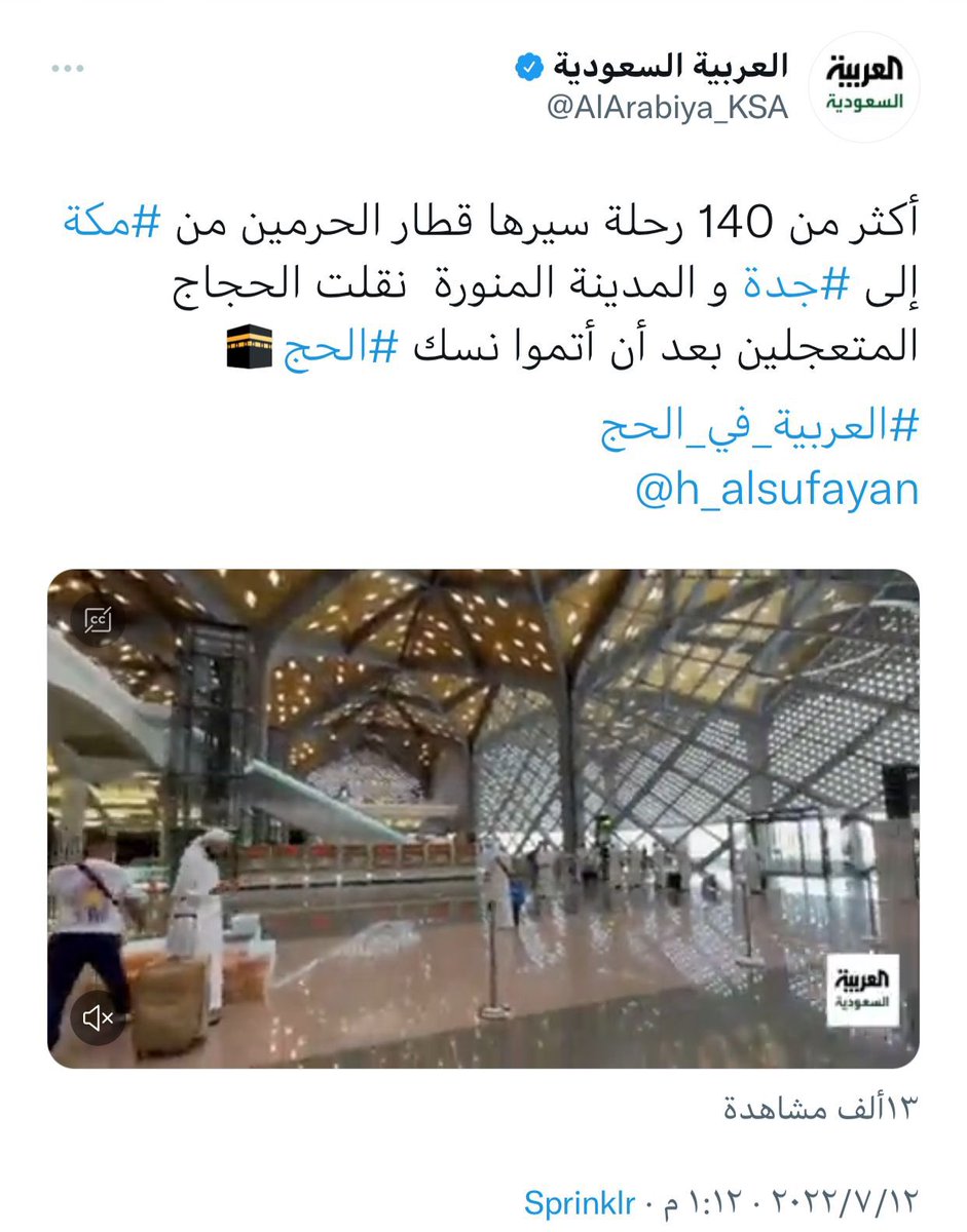 تصل الطاقة الاستيعابية لـ #قطار_الحرمين_السريع إلى 72 ألف حاجاً في الساعة