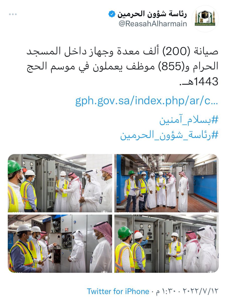 تشغيل وصيانة #الحرمين_الشريفين #المسجد_الحرام و #المسجد_النبوي بما تحتوي من مرافق إنشائية وأنظمة ومعدات كهربائية وميكانيكية من تكييف وإنارة وأنظمة مراقبة وسلالم وغيرها الكثير لضمان استمرار الخدمات وعدم انقطاعها بجهود طواقم من مختلف #التخصصات_الهندسية من مهندسين وفنيين وعمالة