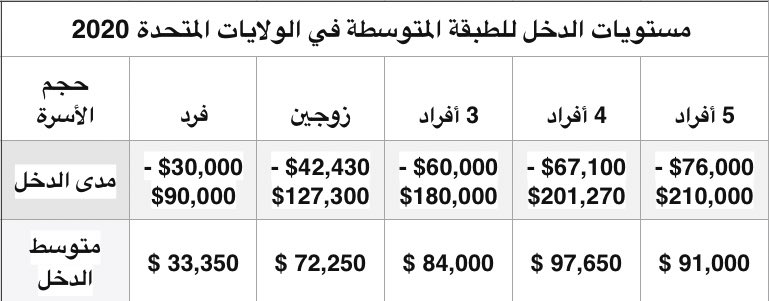 يعرّف "مركز پيو للأبحاث" الطبقة المتوسطة على أنها: الأسر التي تكسب ما بين ثلثي وضعف متوسط دخل الأسرة في الولايات المتحدة.