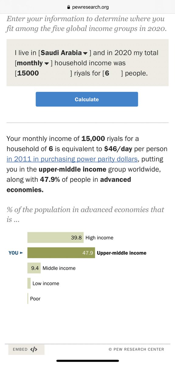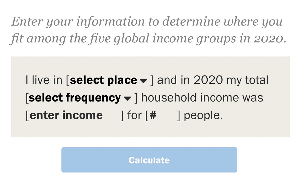 هنا رابط يمكنك إدخال بلدك select place ثم صياغة دخلك شهري monthly أو سنوي annual ثم دخلك بعملة بلدك enter income وعدد أفراد أسرتك #؛ ثم الضغط على Calculate؛ لتحصل على تقدير المركز في أي طبقة تتواجد عالمياً حسب سنة الأساس 2011: