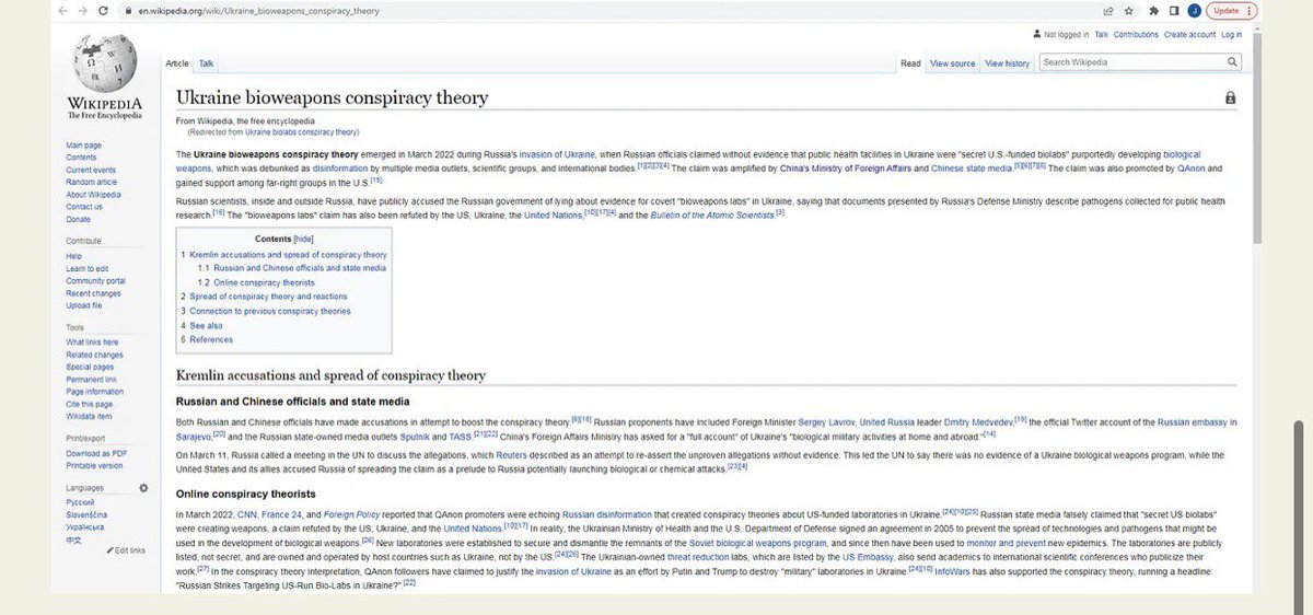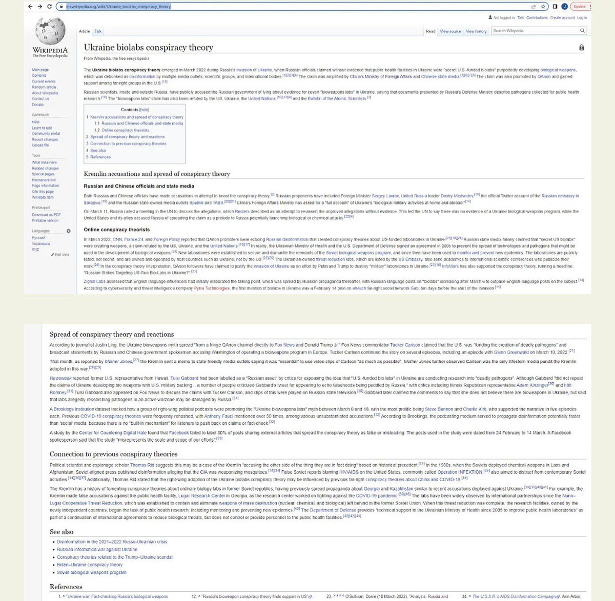 فيما يلي لقطات من صفحة "نظرية المؤامرة البيولوجية الأوكرانية" على موقع ويكيبيديا ، منذ 5 أسابيع. وجميع "عمليات التحقق من صحة الأخبار" المرتبطة بمؤشر الترابط الأصلي الخاص بي للرجوع إليها ، مدعيا أنه لا توجد بيولابس في أوكرانيا.شركات التكنولوجيا الكبيرة ووسائل الإعلام