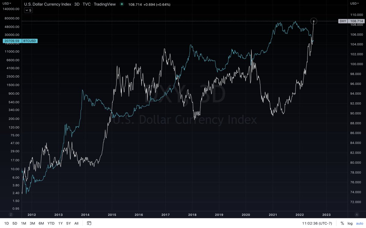 Silny dolar 💵 W kontekście #BTC historia zdaje się powtarzać. Dynamiczne wzrosty wartości $DXY wpędzały krypto w #bearmarket. Cyfrowe waluty potrafiły jednak zmienić trend znacznie wcześniej, a spadki na dolarze dodawały tylko paliwa w hossie.