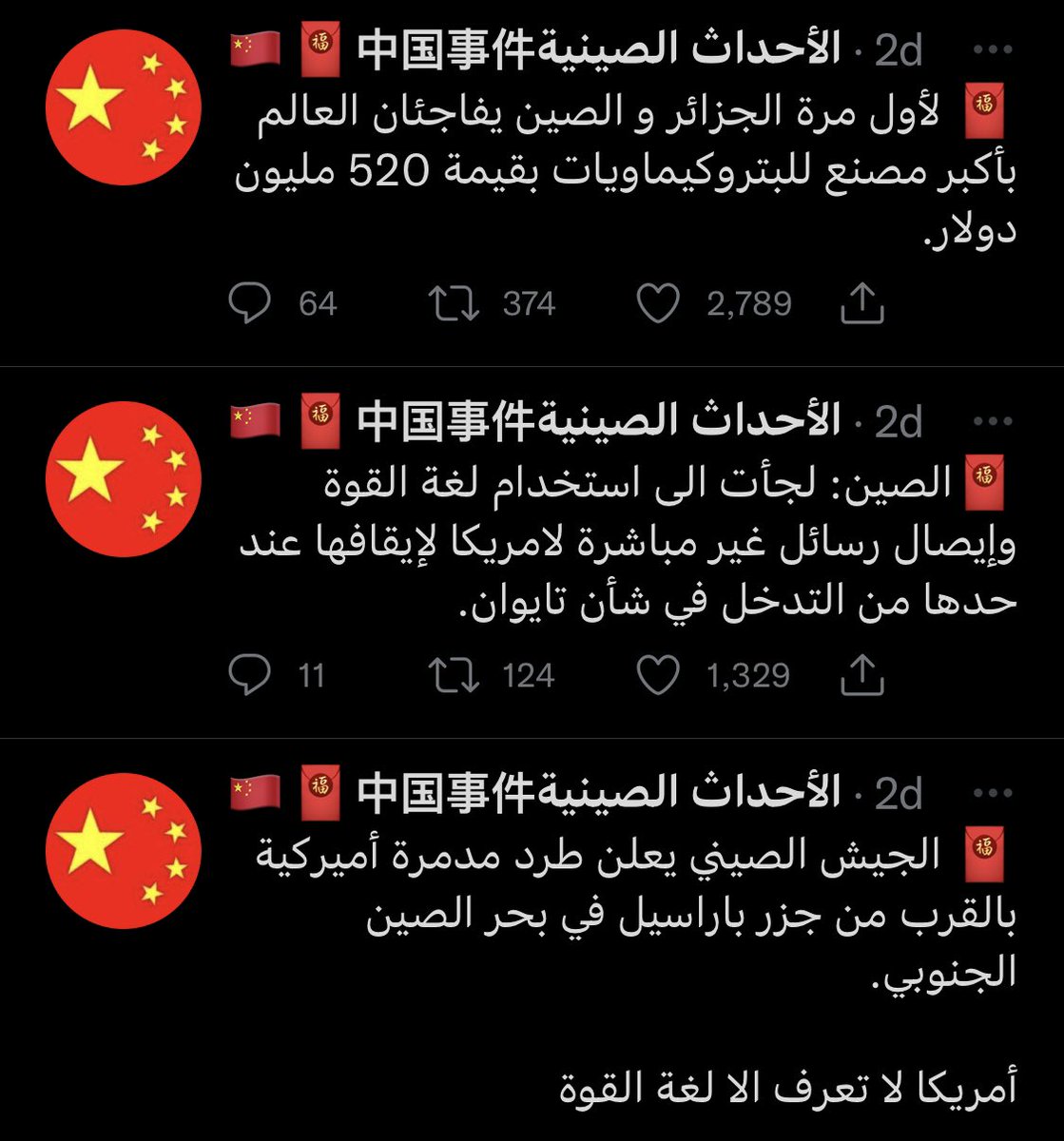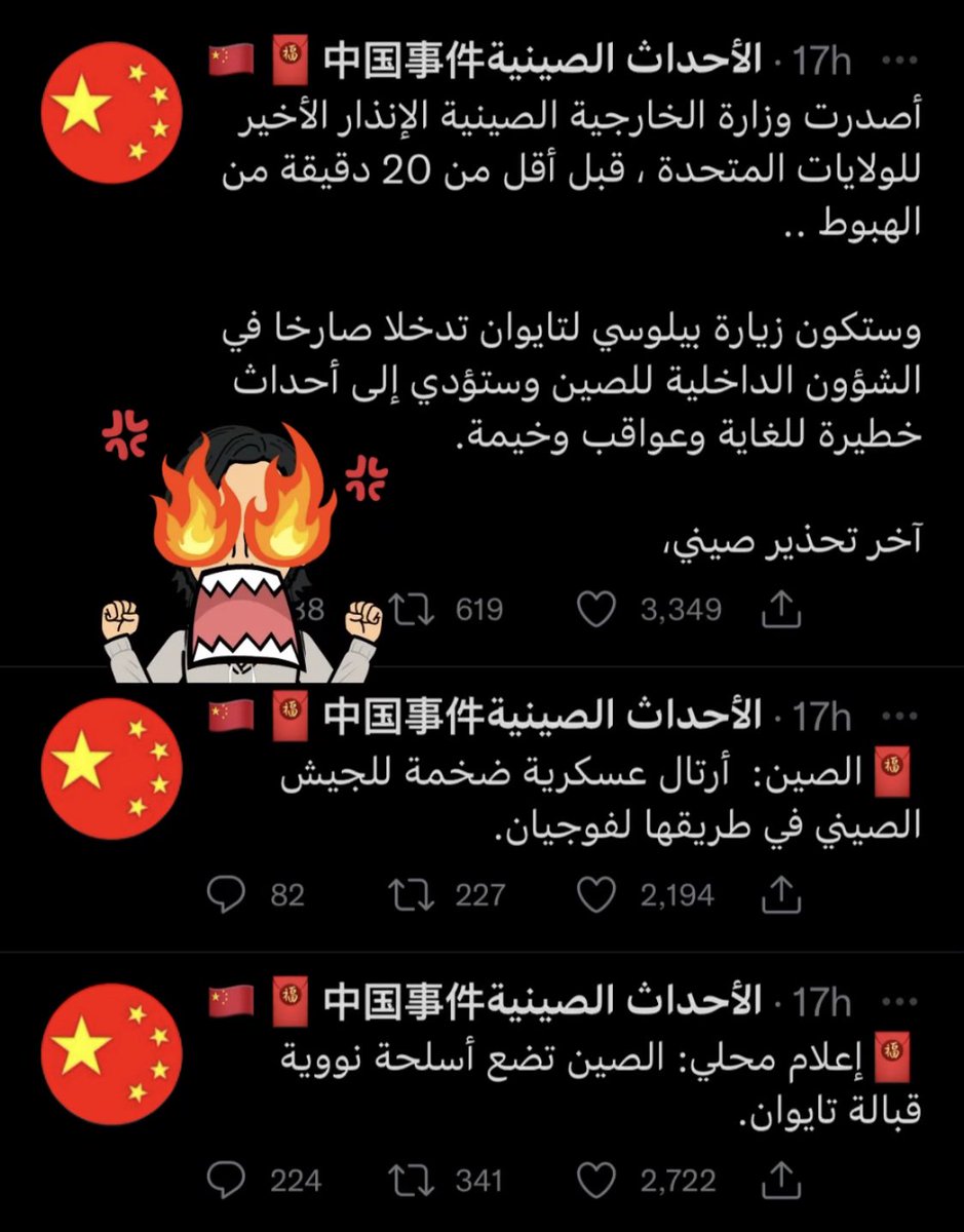 أيام و حسابات الأخبار "البطيخية" تزبد و ترعد عن الحرب العالمية الثالثة و كيف ستسقط الصين طائرة نانسي بيلوسي، و حديث عن تحريك البوارج الصينية و تمركز منصات الصواريخ النووية قبالة تايوان، و ما إلى ذلك من مبالغات و اكشن في سبيل التفاعل.. و في الآخر: