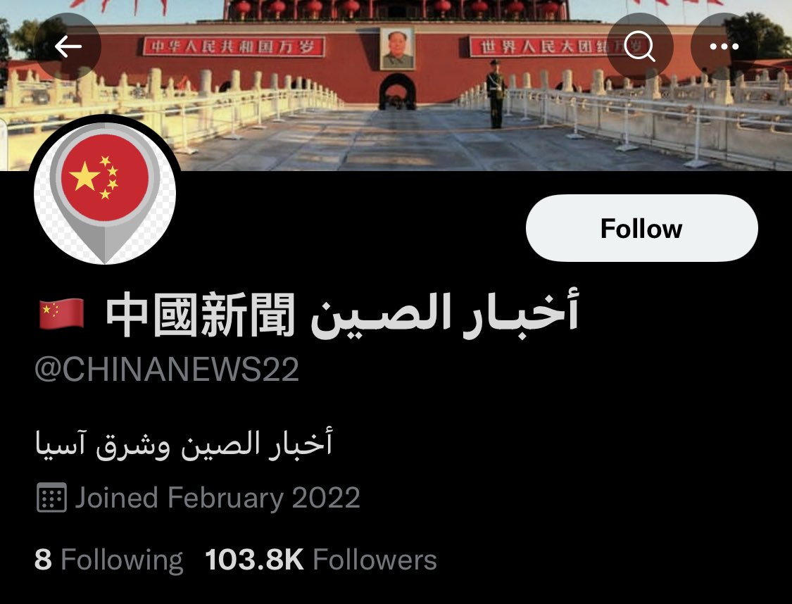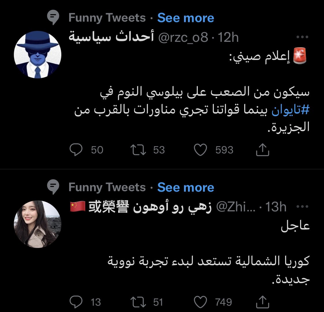 حساب "أخبار الصين" على تويتر، يحذر من حساب "الأحداث الصينية" ويقول أنه حساب مشبوه! اثنينهم يقدمون نفسهم كحسابات متخصصة بالشأن الصيني، لكن اعتقد الحذر مهم منهم الاثنين، ومن جميع الحسابات التي ظهرت مؤخرا كمتخصصة في "أحداث" هنا و هناك، حتى لو كان بعضها جيد، لأنها غير معروف من يديرها