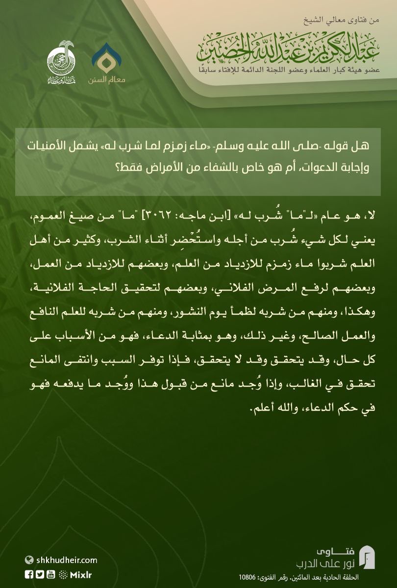 هل قوله -صلى الله عليه وسلم- «ماء زمزم لما شرب له» يشمل الأمنيات وإجابة الدعوات، أم هو خاص بالشفاء من الأمراض فقط؟