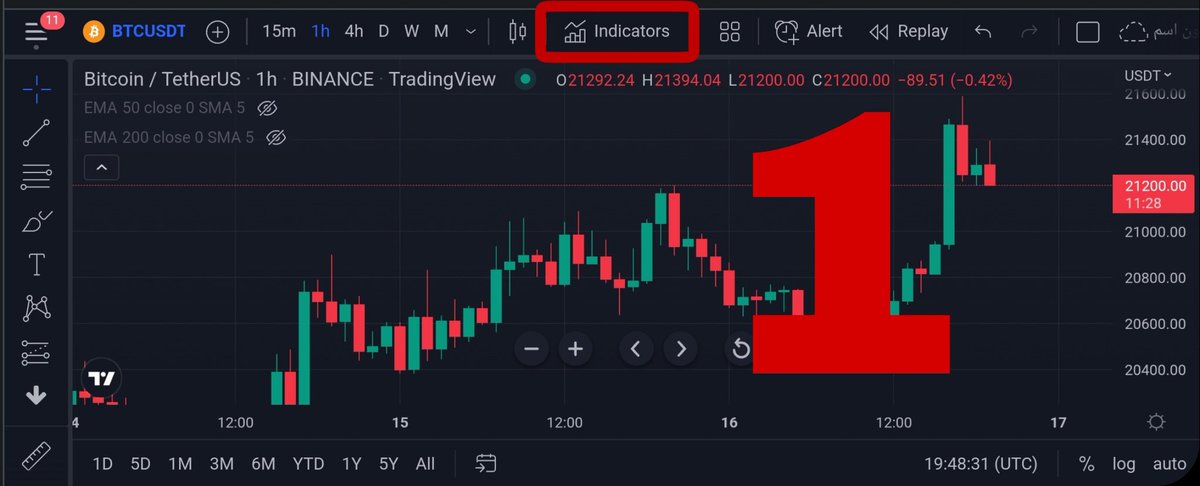 قم بإختيار أي عمله، على سبيل المثال عملة #Bitcoin وبعد ذلك قم بالضغط على "Indecators" ومن ثم كتابة إسم المؤشر "Trendlines with breaks"