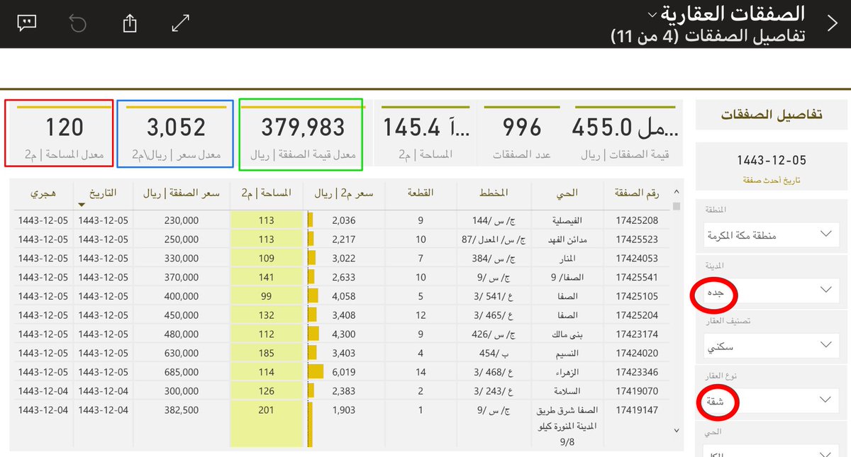 اما على مستوى مبيعات الشقق التمليك فان مدينة جدة تصدرت المبيعات بعدد 996 شقة مباعة بقيمة 455 مليون ريال بفارق طفيف عن مدينة الرياض928شقة مباعة بقيمة 429 مليون ريال ويلاحظ ان متوسط مساحة الشقه بجدة 120 م مقارنه ب 146م بالرياض اما على مستوى متوسط سعر البيع فان الرياض اغلى من جده