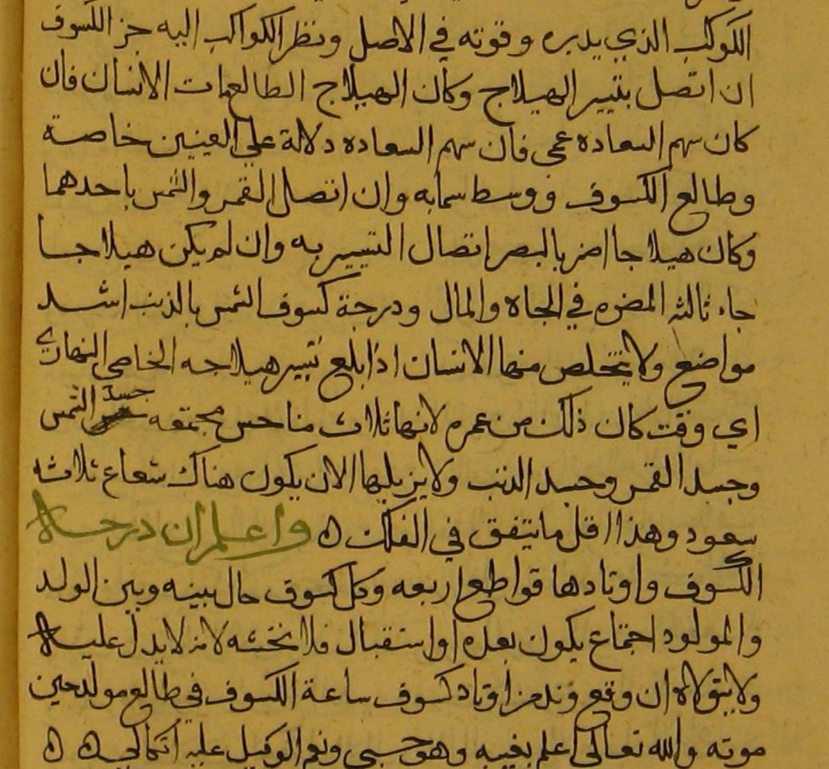 ودرجة كسوف الشمس بالذنب اشد المواضع ولا يتخلص منها الانسان اذا بلغ تسير هيلاجه النهاري أي وقت كان ذلك من عمره لانها ثلاث مناحس مجتمعه جسد الشمس وجسد القمر وجسد الذنب ولا يزيلها الا ان يكون هناك شعاع ثلاث سعود وهذا قل ما يتفق في الفلك.