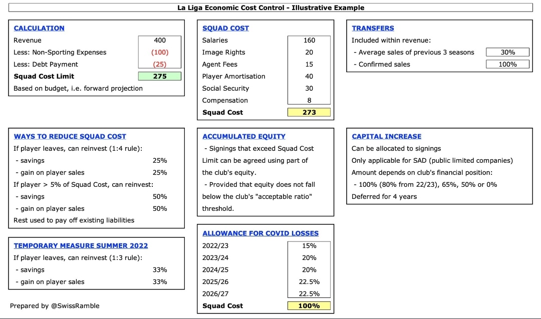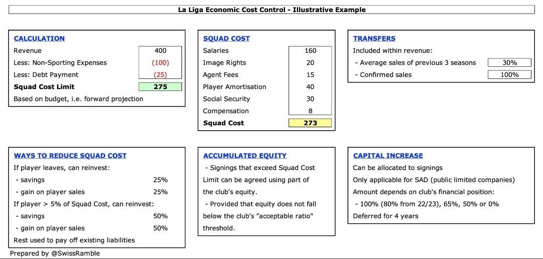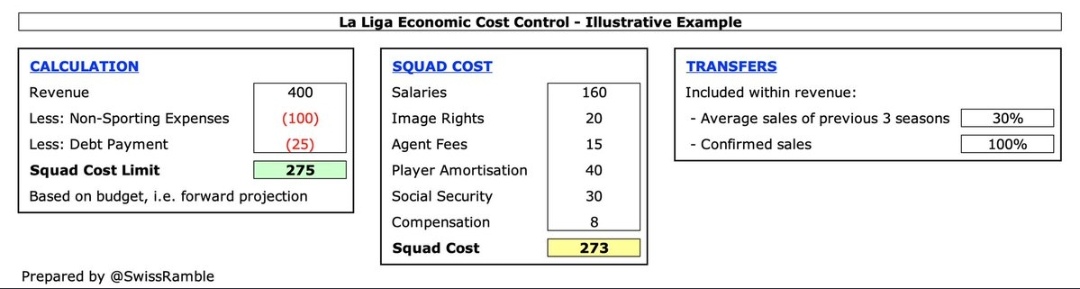 أوضح خافيير تيباس أنهُ في حال أقدم برشلونة على بيع عقد لاعب بقيمة 100M€ فإنهُ يُمكنهُم إنفاق 25M€ فقط، إن رغبَ البارسا بأحضار لاعب أجرهُ السنوي يُكلّف 25M€ فعليهم كسب 100M€ إمّا عن طريق الإنتقالات أو تخفيض أجور لاعبي الفريق