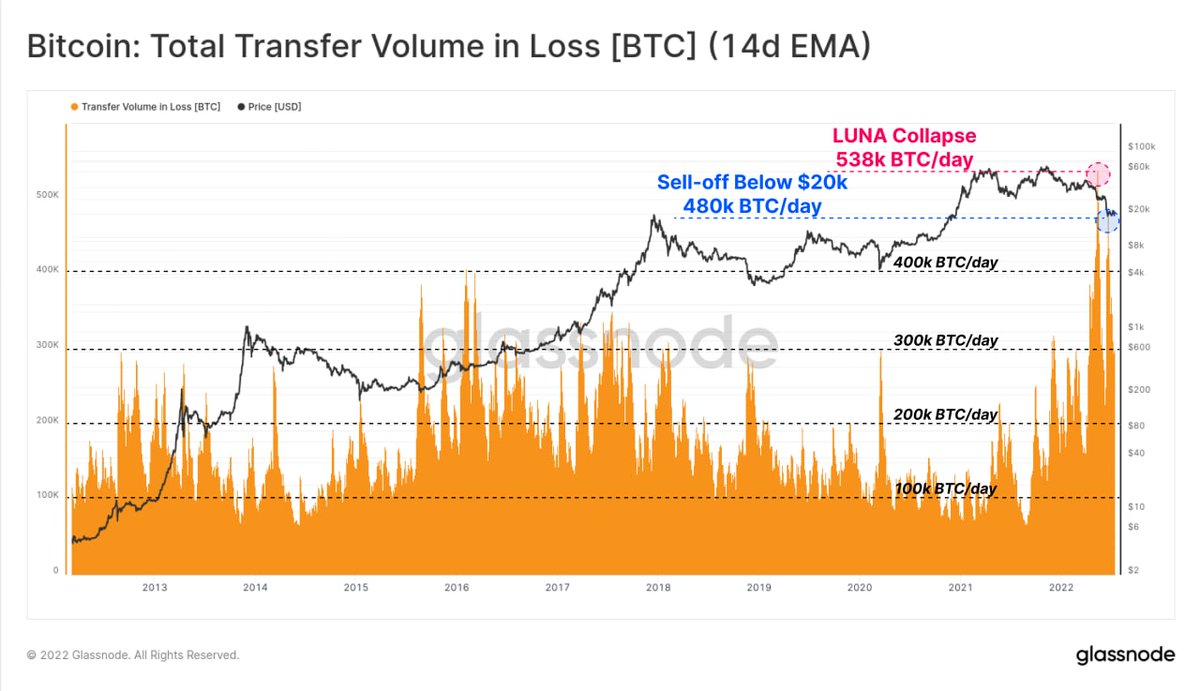 تقريبا 500 الف بتكوين يتم تداولها بخسارة وهذا اكثر بكثير من الماضي "الخسارات في كل مكان"