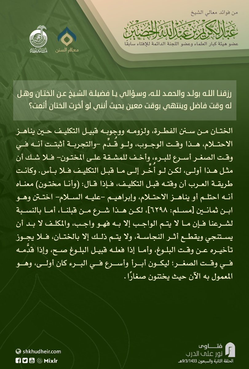 رزقنا الله بولد والحمد لله، وسؤالي يا فضيلة الشيخ عن الختان وهل له وقت فاضل وينتهي بوقت معين بحيث أنني لو أخرت الختان أثمت؟