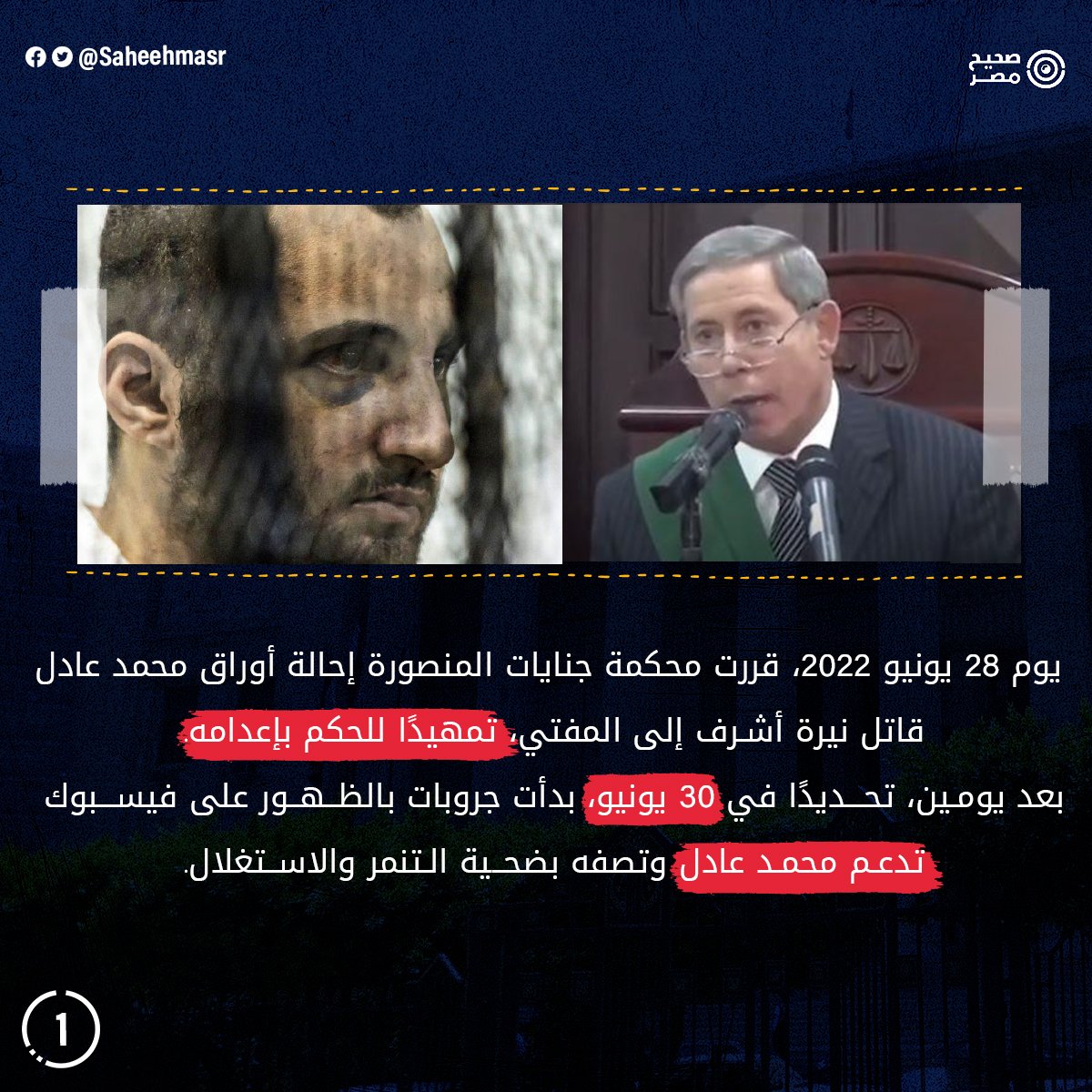 ✅ يوم 28 يونيو 2022، قررت محكمة جنايات المنصورة إحالة أوراق محمد عادل قاتل نيرة أشرف إلى المفتي، تمهيدًا للحكم بإعدامه.