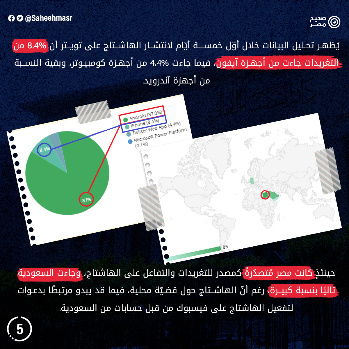 📌 يُظهر تحليل البيانات خلال أوّل خمسة أيّام لانتشار الهاشتاج على تويتر أن 8.4% من التغريدات جاءت من أجهزة آيفون، فيما جاءت 4.4% من أجهزة كومبيوتر، والبقية من أجهزة آندرويد، وكانت مصر مُتصدّرةً كمصدر للتغريدات والتفاعل على الهاشتاج، وجاءت السعودية تاليًا بنسبة كبيرة.