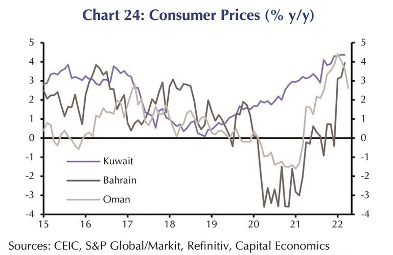 تضخم السودان بظل الانخفاض الحاد بسعر العملة ورفع الدعم عن الوقود بسبب أزمة مالية واقتصادية، وتضخم لبنان بسبب تهاوي العملة ورفع الدعم عن عديد من السلع الأساسية نتيجة أزمة اقتصادية وسياسية تتعرض لها البلاد،وتضخم تركيا مع الأوضاع الاقتصادية وخفض أسعار الفائدة والتضرر الكبير للعملة..