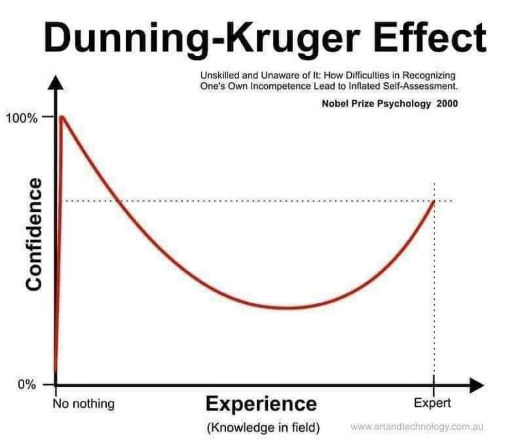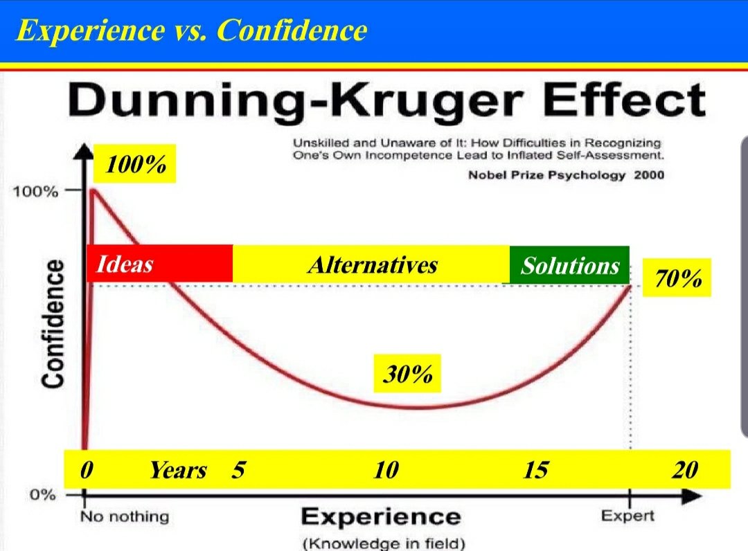 - الجانب الأيسَر من المُنحنى: (الثقة الزائدة بالنفس). ويمكن ملاحظة أنه في الوقت الذي تكون خِبراتُ الإنسان ومعارفُه(صفر) فإنّ ثِقَتَه بنفسه تكون (100%) ، يعني أن الجاهل يَستَشعِر ثِقةً لا مثيل لها في آرائه وأطروحاته ولا يَشُكّ مُطلقاً في قدراته وعِلمِه وصِحّة آرائه؛