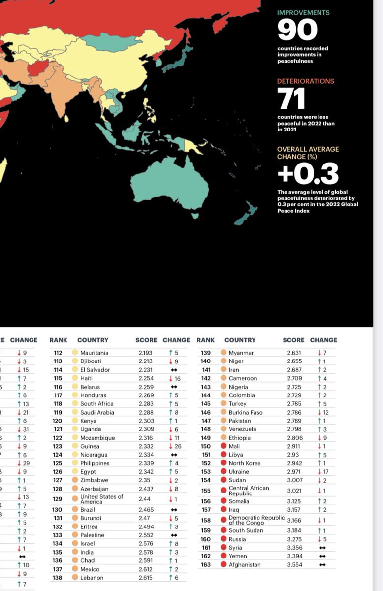 1️⃣على الرغم من حجم الانفاق على الاجهزة الامنية والتسليح منذ اول حكومة منتخبة في العراق عام 2005 وحتى اليوم ومع هذا فان العراق لايزال من الدول التي تهددها الصراعات والعنف وهو ضمن العشر دول الاقل سلاماً في العالم حسب تقرير السلام العالمي 2022 @GlobPeaceIndex