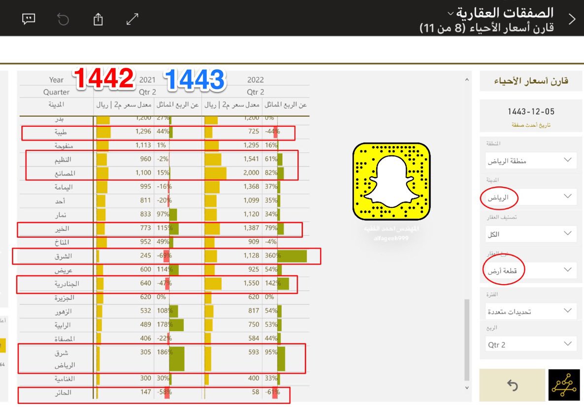 اولا : التغيرات السعرية لمخططات مدينة الرياض ( الاعلى ارتفاعا / والاعلى انخفاضا ) بدء من نهاية العام الماضي 1442 الى نهاية العام 1443 في منتج الاراضي السكنية