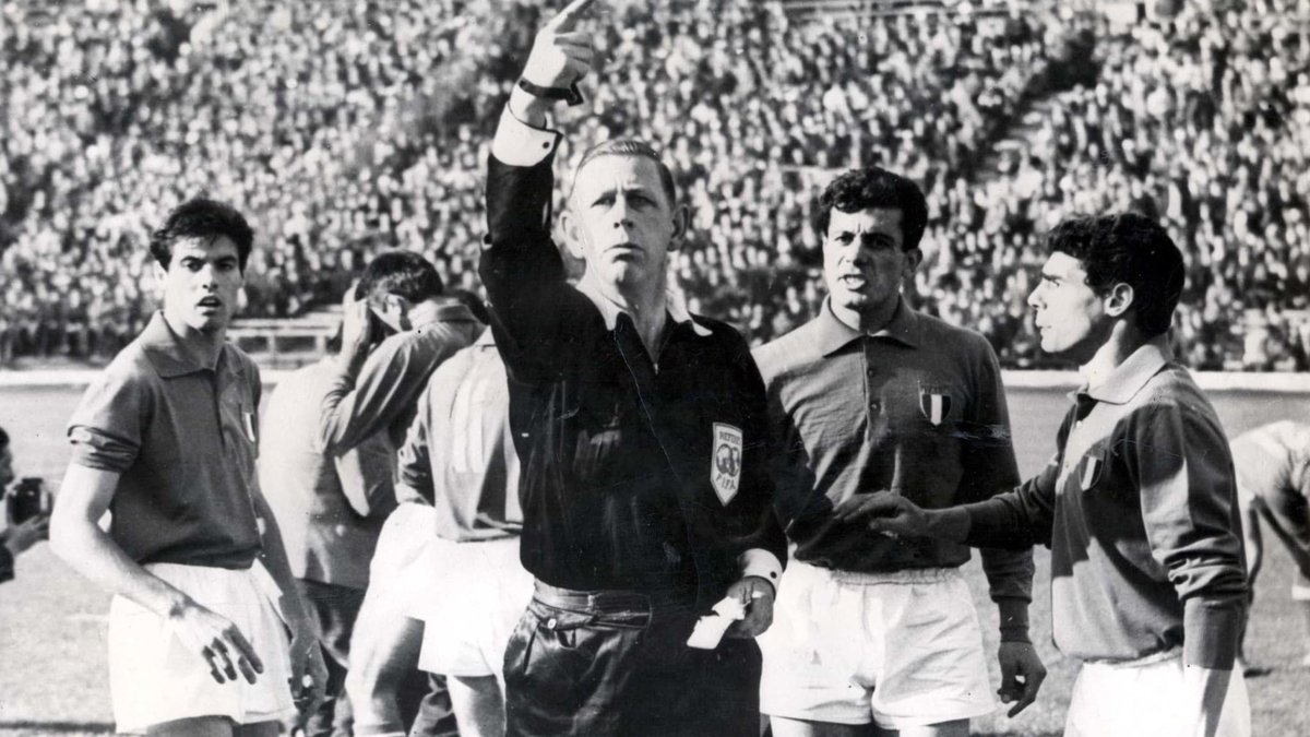 لم يكن هناك بطاقات في كرة القدم حتى سنة 1963 في مباراة تشيلي وايطاليا. حيث طلب الحكم الانكليزي كين استون من لاعب ايطاليا جيورجوي فيريني الخروج بعد عرقلة قاسية على لاعب الخصم. فيريني لم يفهم الحكم لذا اقترح فكرة البطاقات الصفراء والحمراء للتواصل مع اللاعبين.